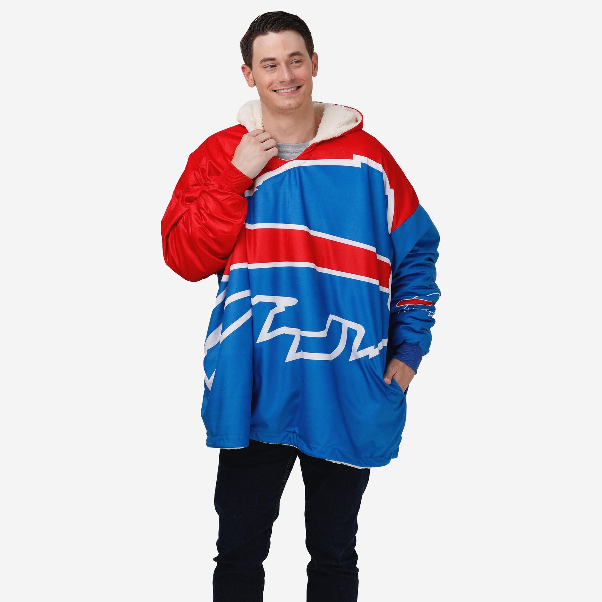 Never before has fandom looked so good and felt so relaxing. Lounge like a legend while you cheer your team on to victory by rocking this Buffalo Bills Reversible Colorblock Hoodeez.
