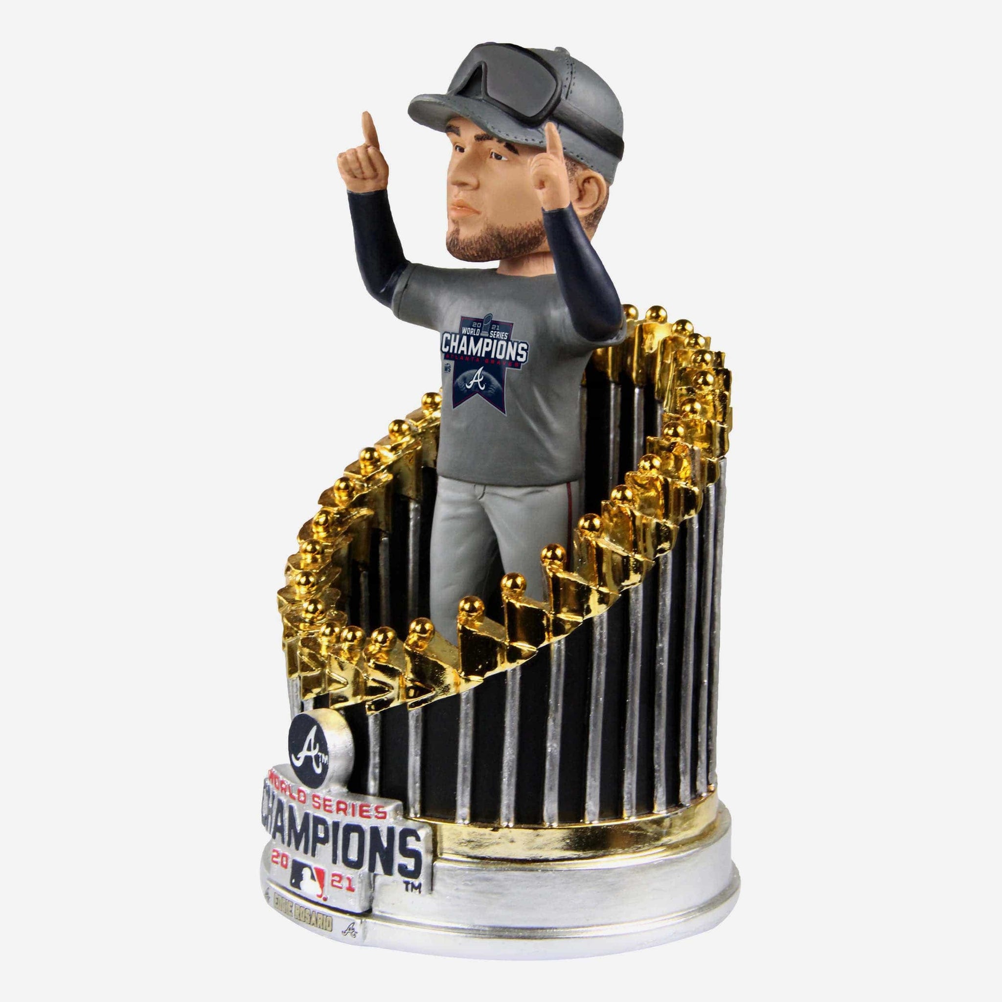 Time to celebrate the big win! Would you rather celebrate with some superstar power or a little hardware? How about both? Both is good. Introducing the Eddie Rosario Atlanta Braves Player in Trophy 2021 World Series Champions Bobblehead!