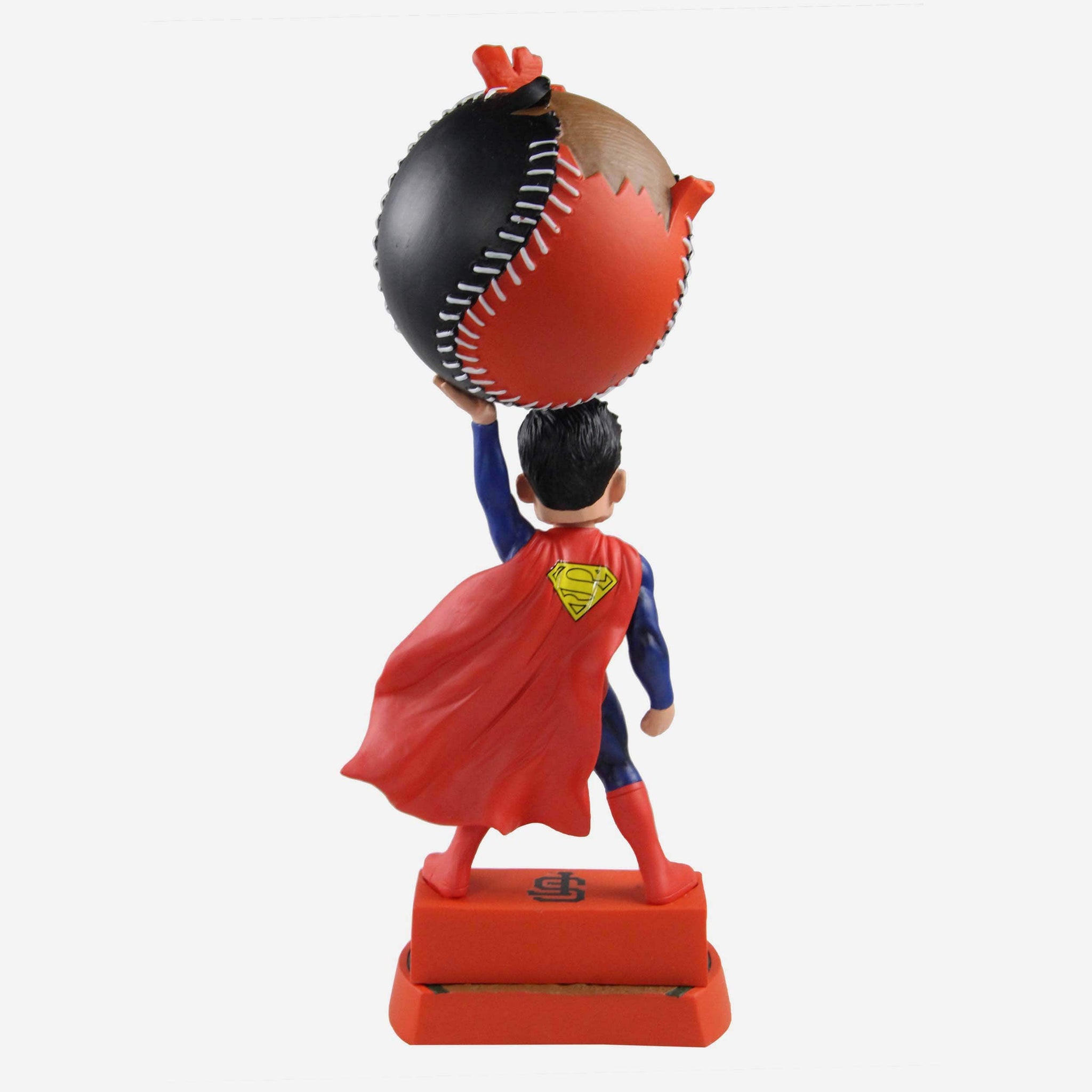 - Portrays Superman posing and holding a team-colored baseball with team logo display, showing off that super strength