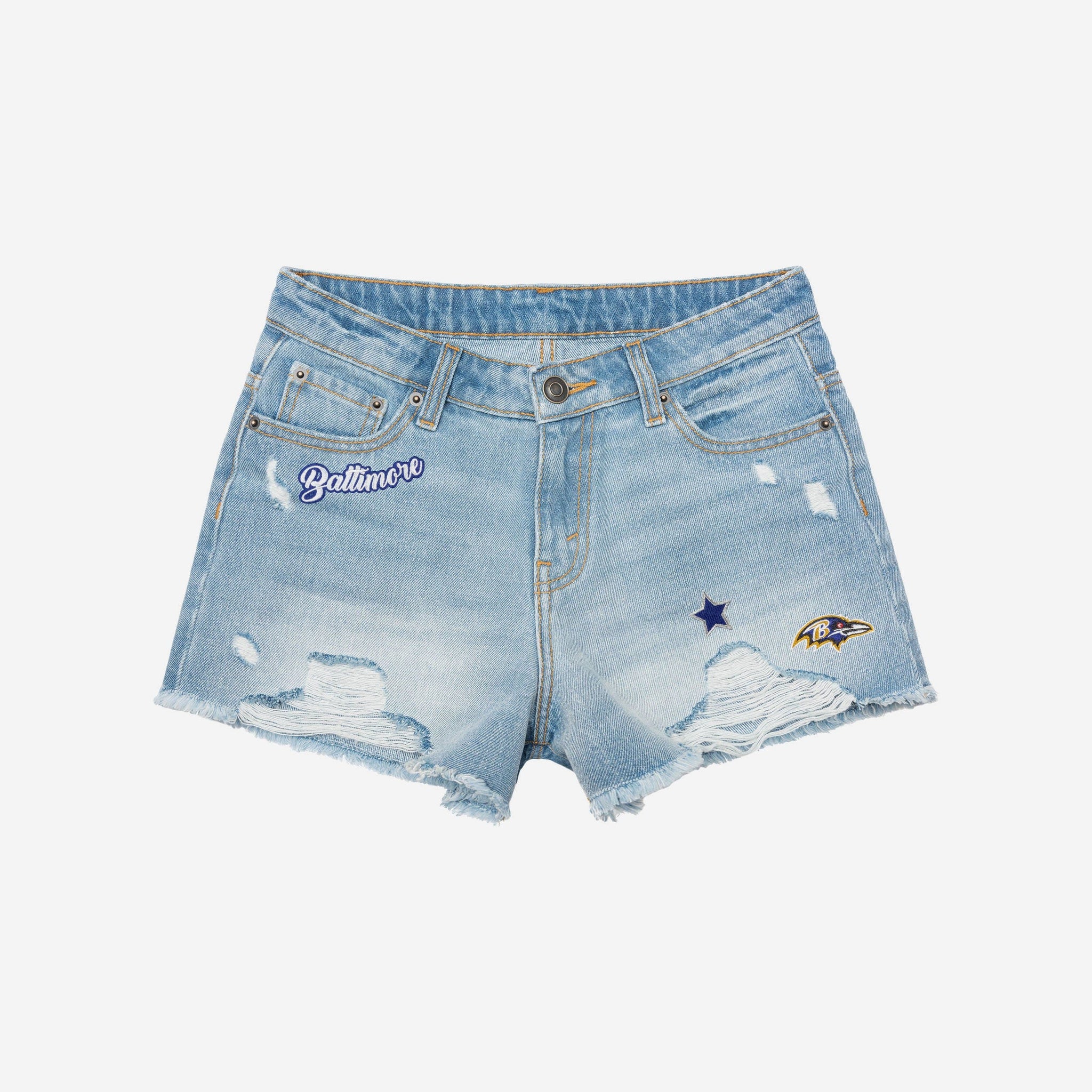 Just because the temperature outside is rising doesn't mean you should stop bringing the heat. Dress to impress at every game, tailgate, concert, barbecue, or wherever your fandom takes you with these Baltimore Ravens Women's Team Logo Denim Shorts.