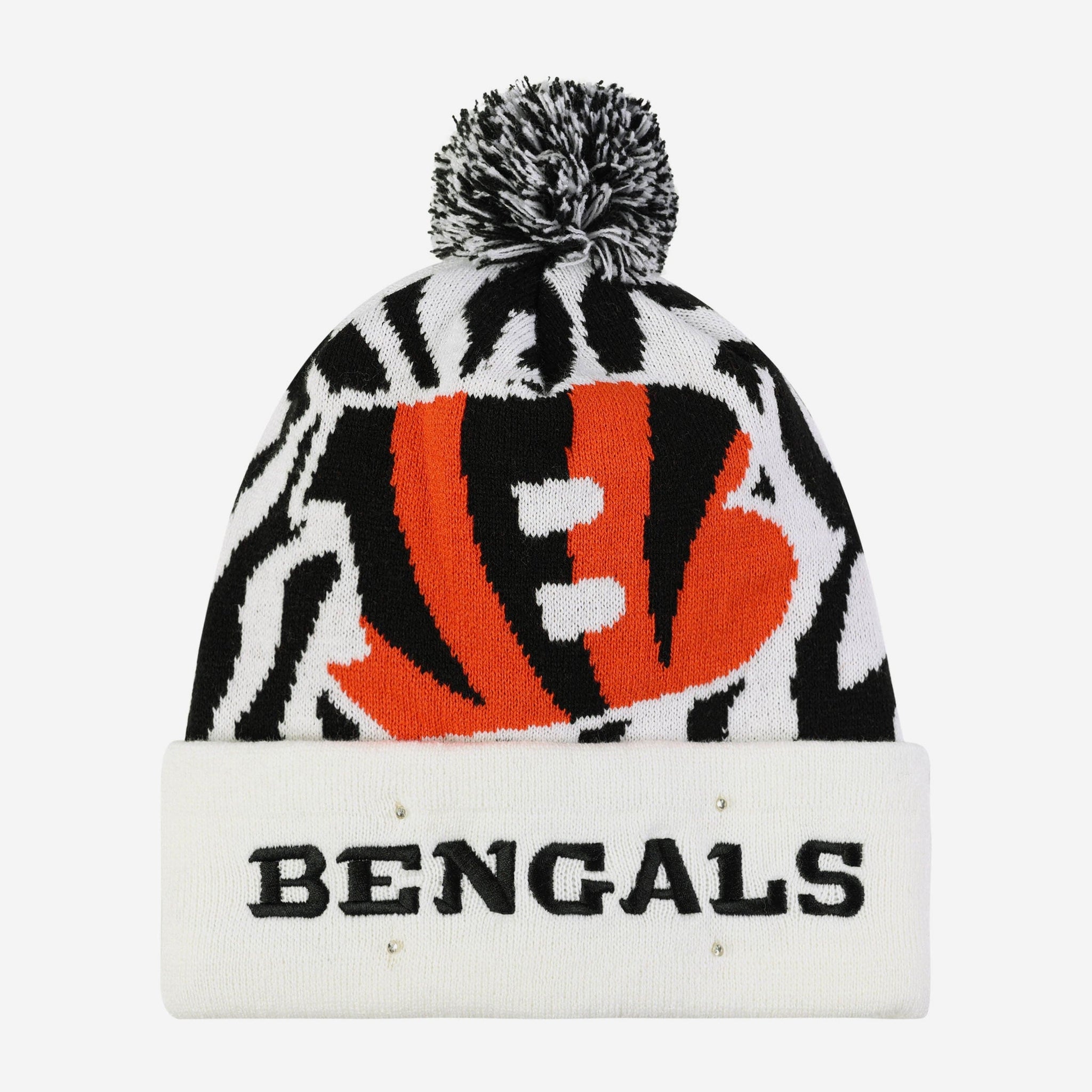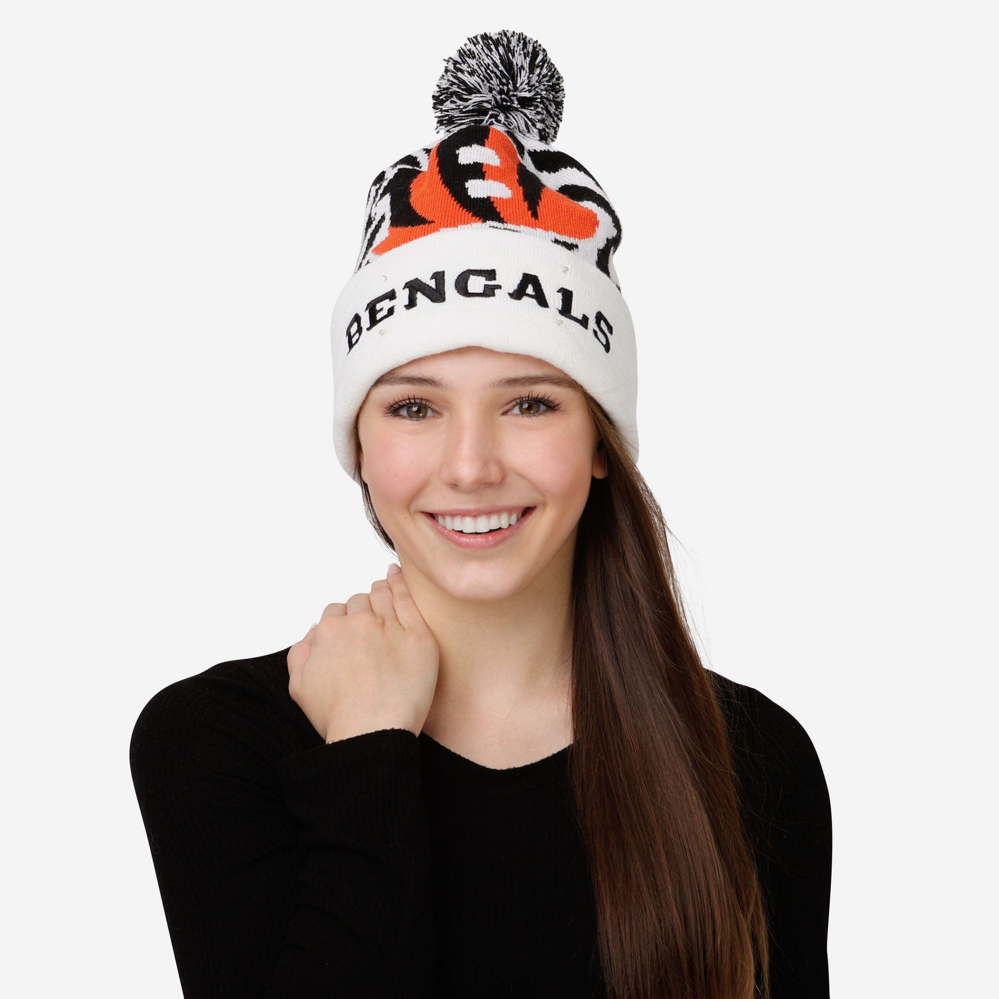 Dress to match the snowy weather all winter long while making sure your team spirit shines brighter than ever with this Cincinnati Bengals White Stripe Big Logo Light Up Beanie.