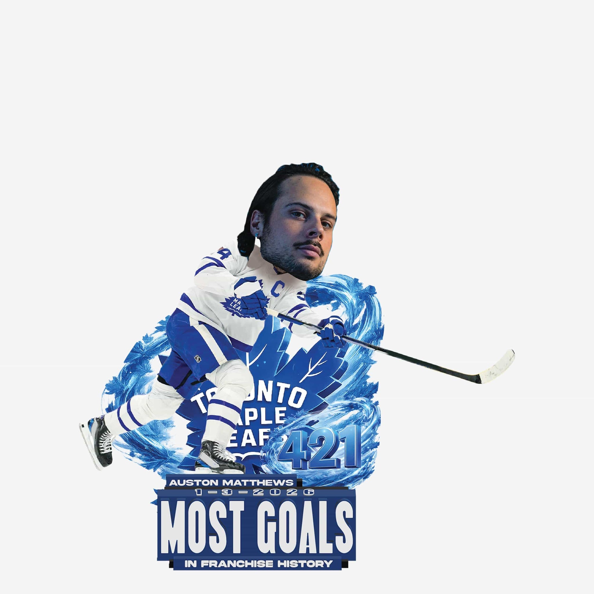 - Portrays Auston Matthews in his Toronto Maple Leafs gameday uniform, captured mid-shot as he continues to make history
