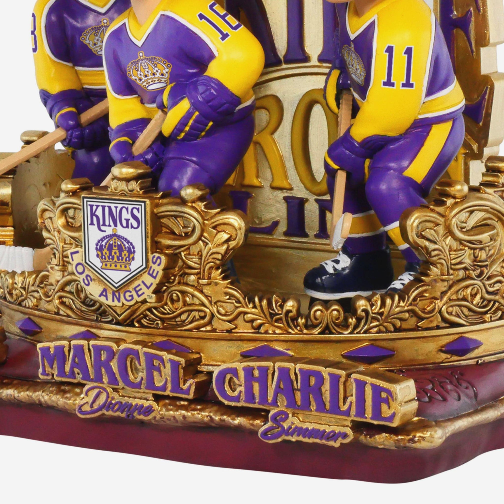 - Mini bobblehead scene featuring Marcel Dionne, Dave Taylor, and Charlie Simmer in their classic Los Angeles Kings uniforms