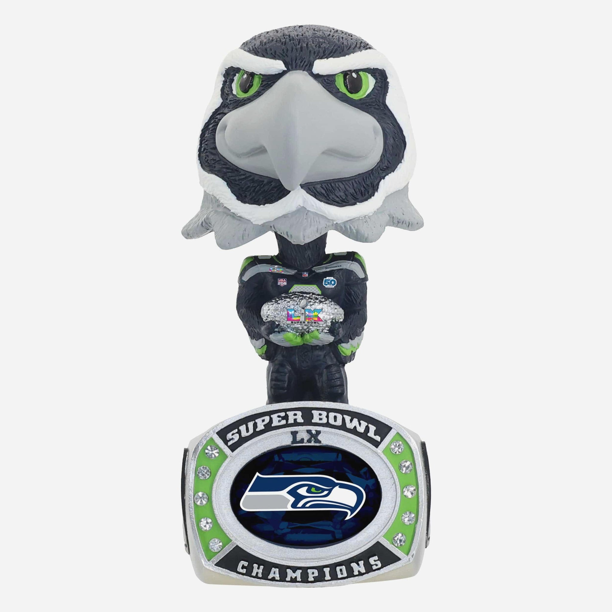 Add some championship bling to your bobble collection! The Super Bowl celebration rolls on with the Blitz Seattle Seahawks Super Bowl LX Champions Ring Base Bighead Bobblehead.