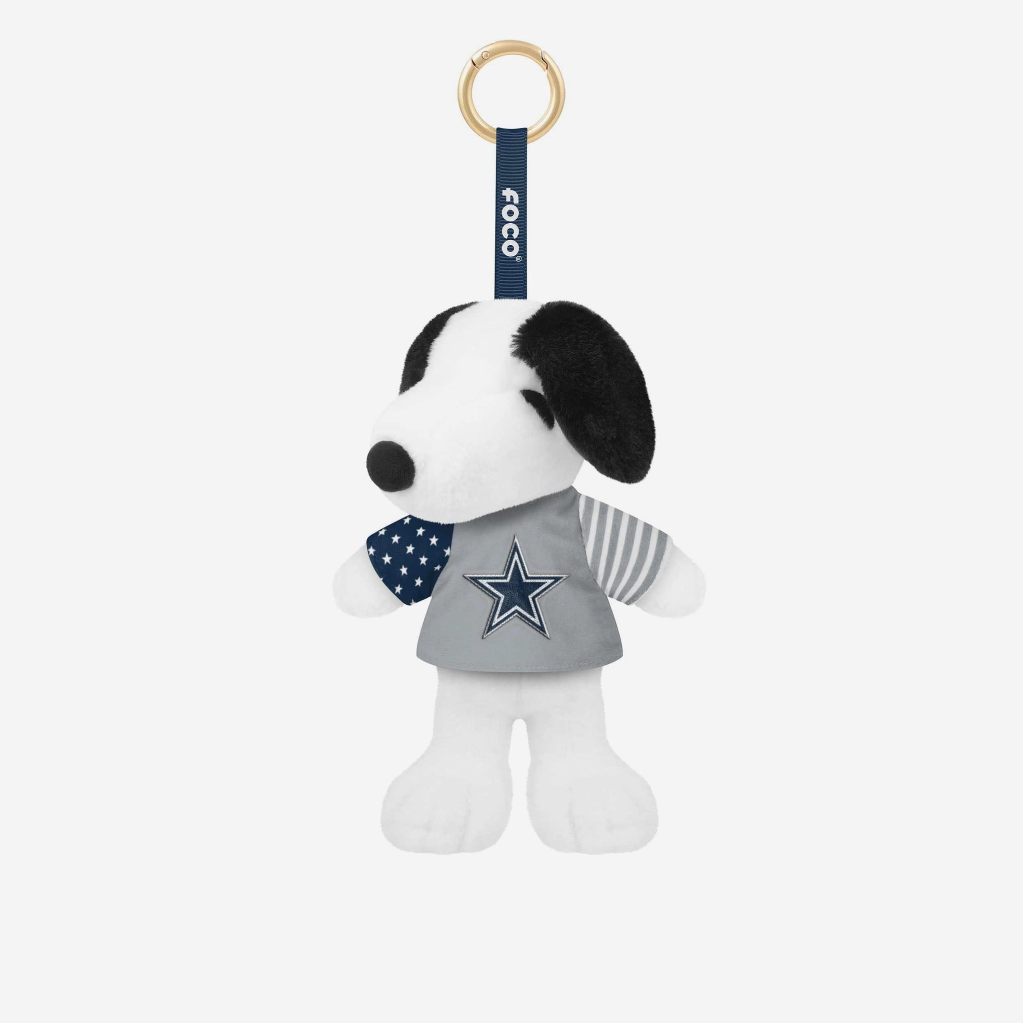Show off your team pride with an all-American twist! The Dallas Cowboys Americana Plush Snoopy Peanuts Bag Charm Keychain brings everyone’s favorite beagle to your fandom in patriotic red, white, and blue style — perfect for keys, backpacks, purses, and more.
