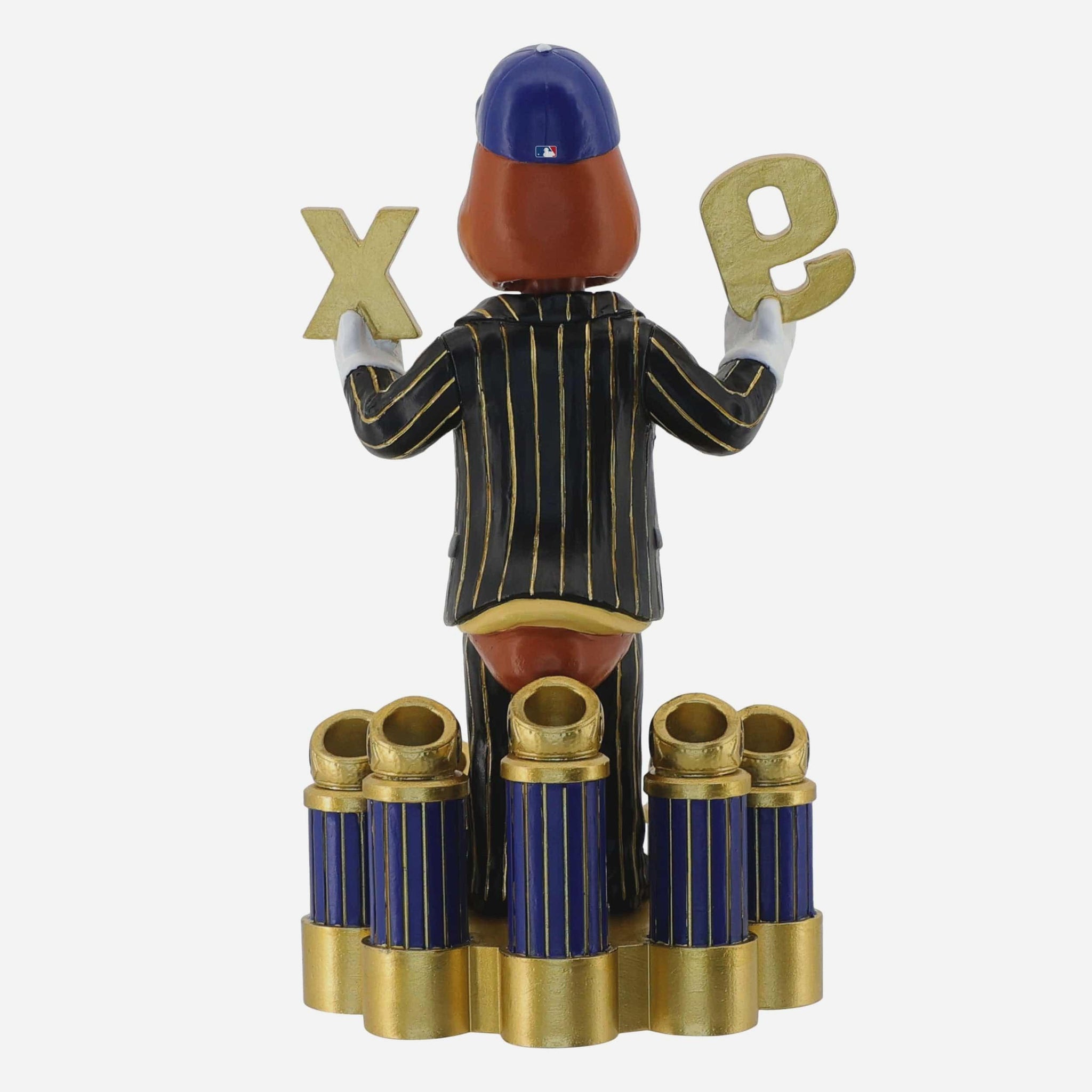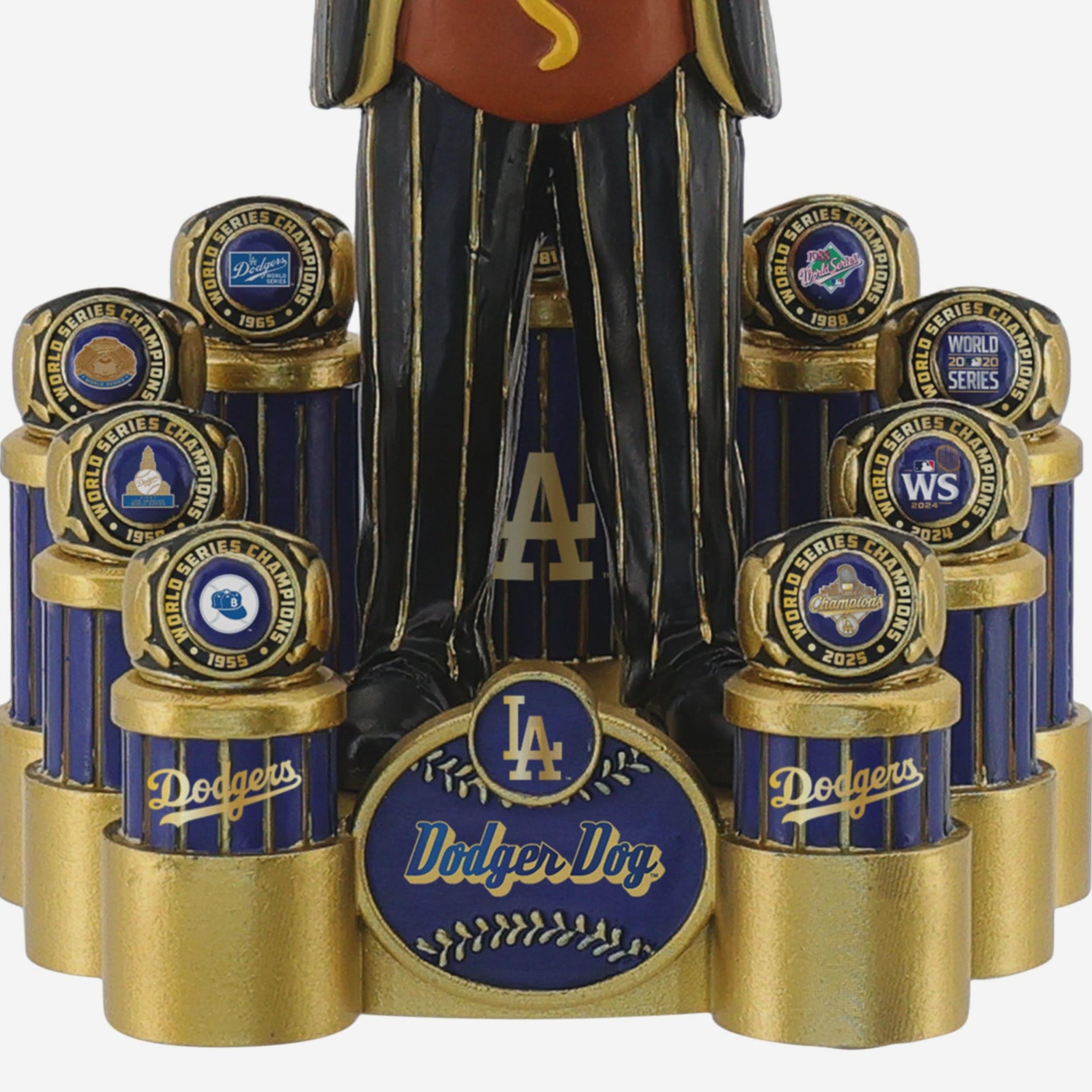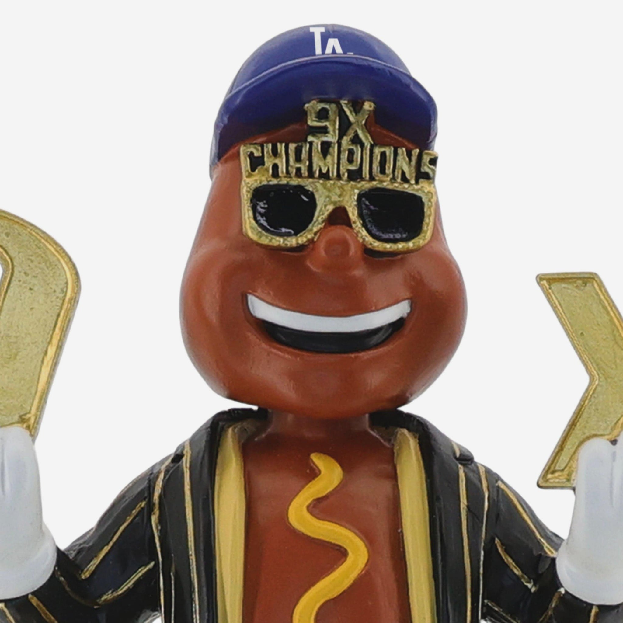 - Portrays the iconic Dodger Dog suited up in a championship-style pinstripe outfit, holding up massive golden “9X” letters for every World Series win