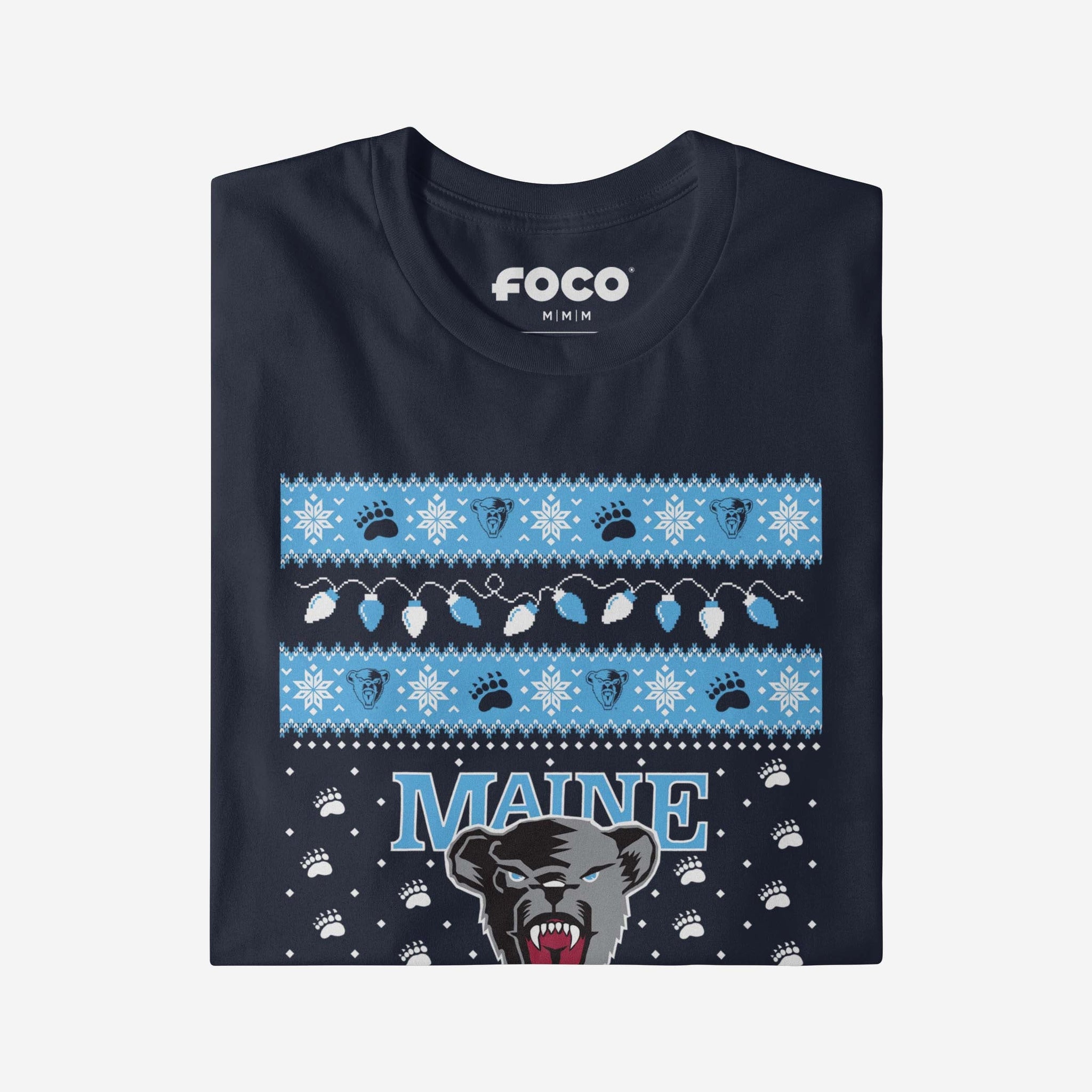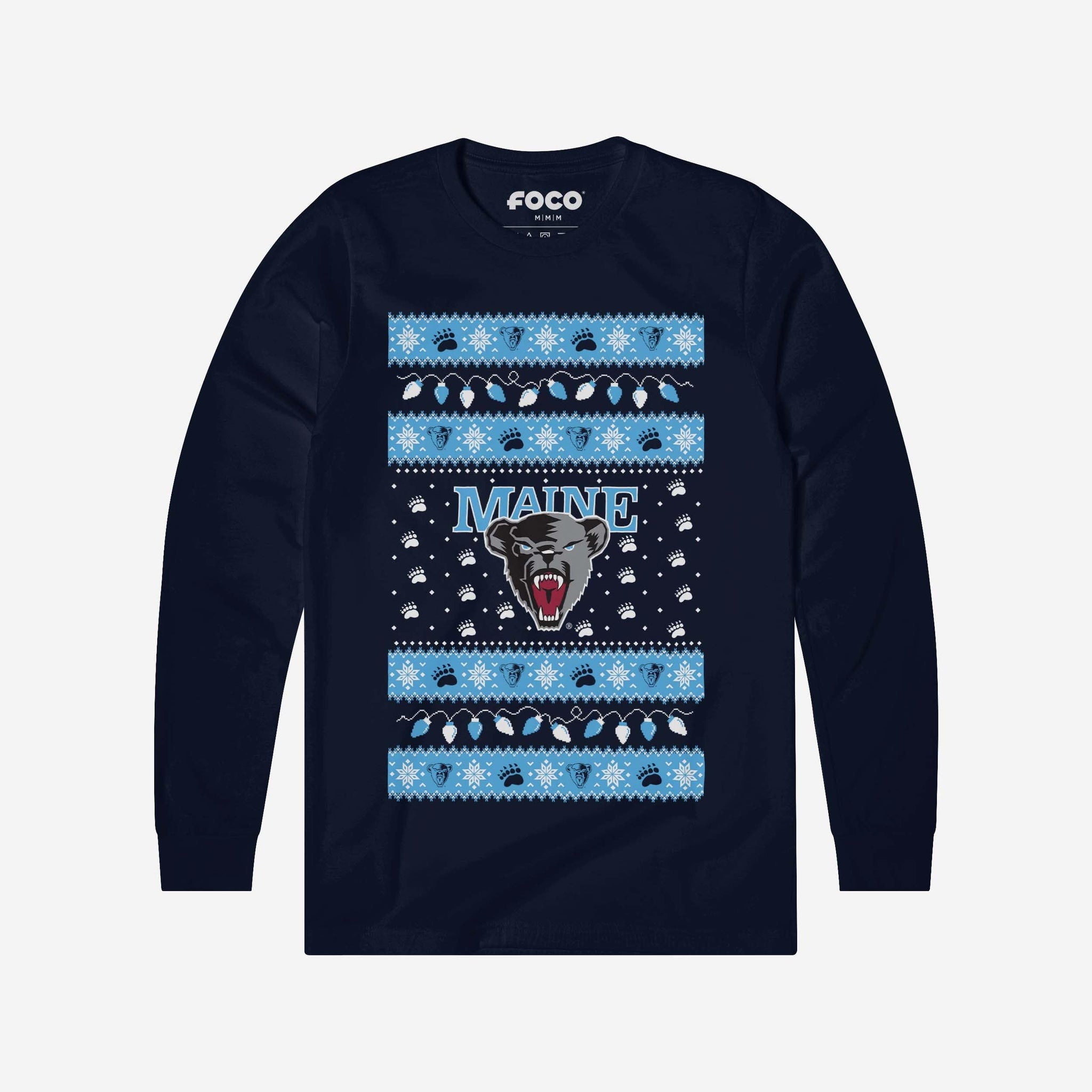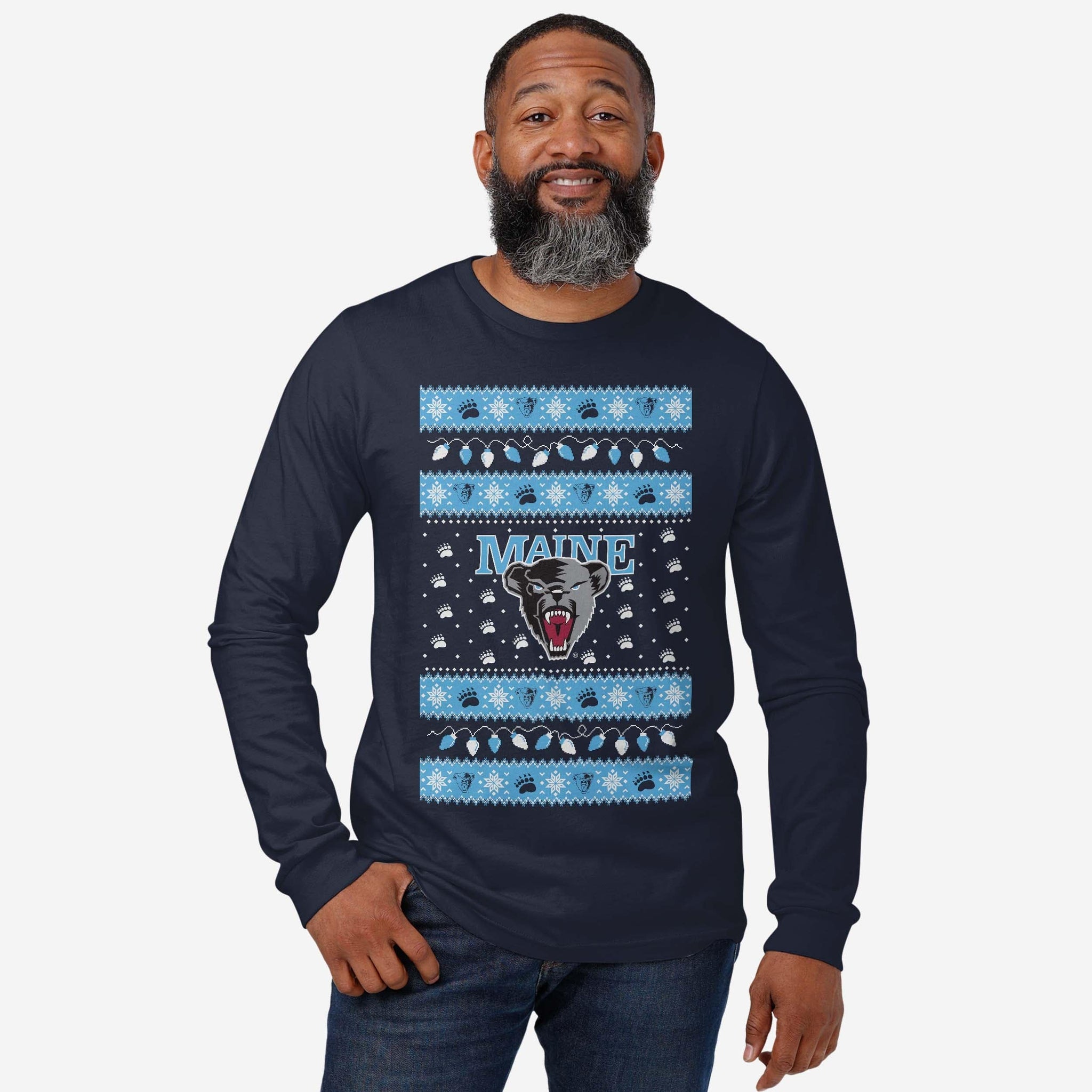 Santa's making a list, and he’s checking it twice! Prove that you’re the nicest fan around with the Maine Black Bears Holiday Lights Sweater Long Sleeve T-Shirt.