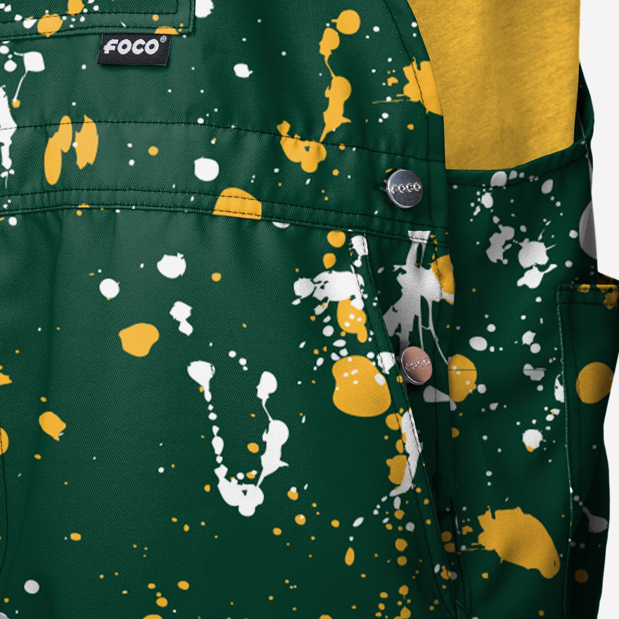 Show your team spirit in these stylish and comfortable Green Bay Packers Men's Paint Splatter Bib Shortalls. With their all-over team-colored design and bold team logo display, these shortalls are the perfect way to show your support for the Green Bay Packers while reminding everyone that your fandom is a masterpiece that even history’s greatest artists would bask in the glory of.