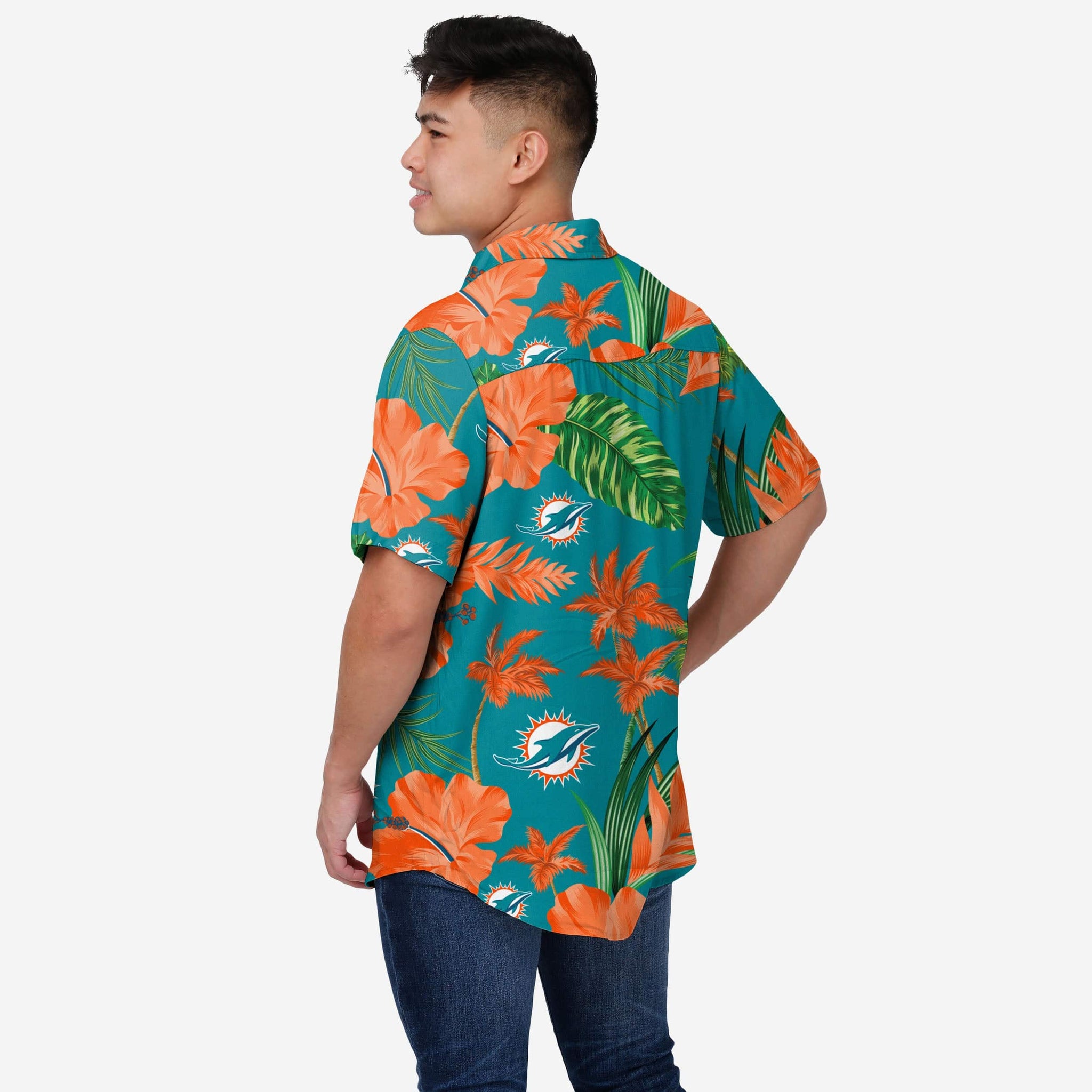 Miami Dolphins Team Color Hibiscus Button Up Shirt FOCO - FOCO.com