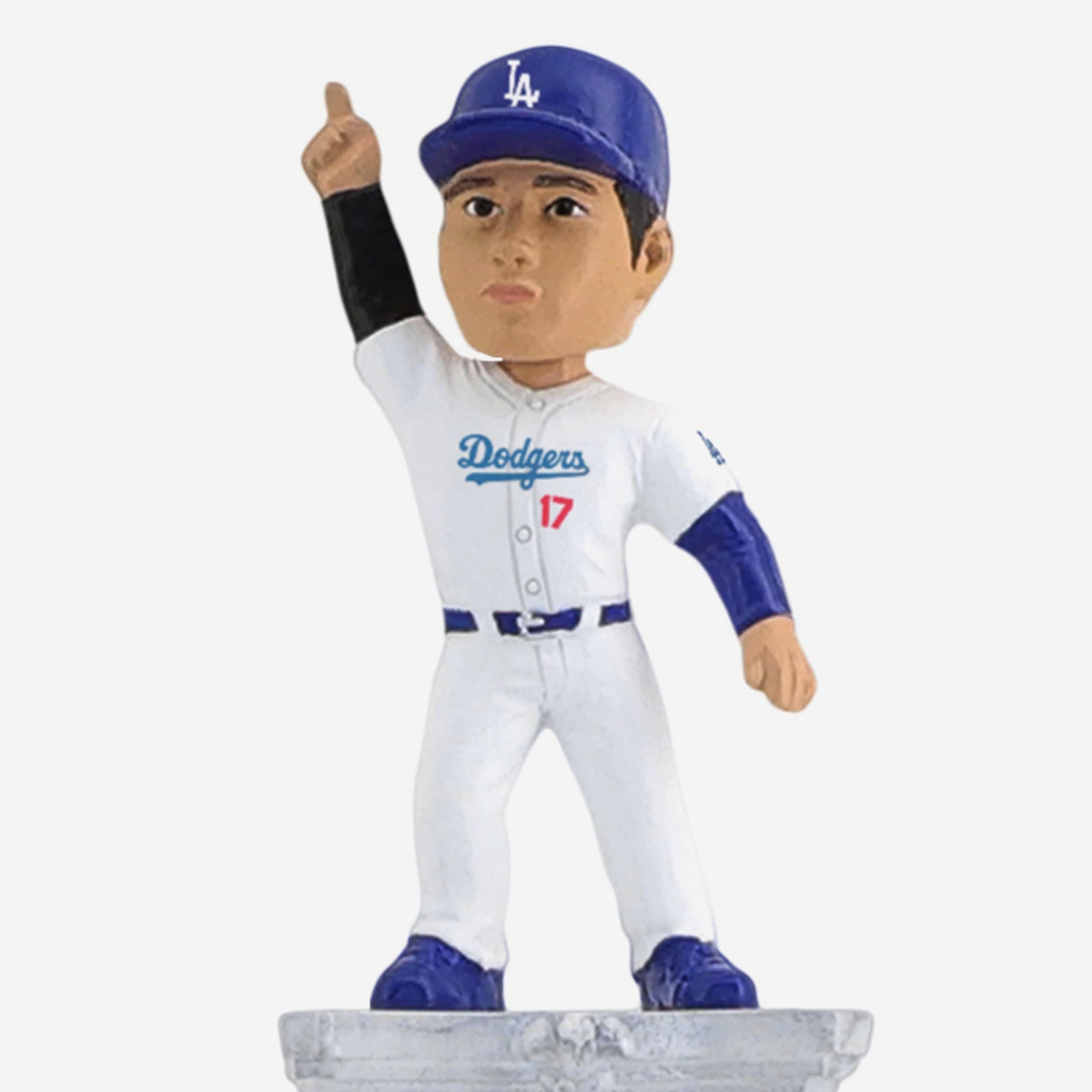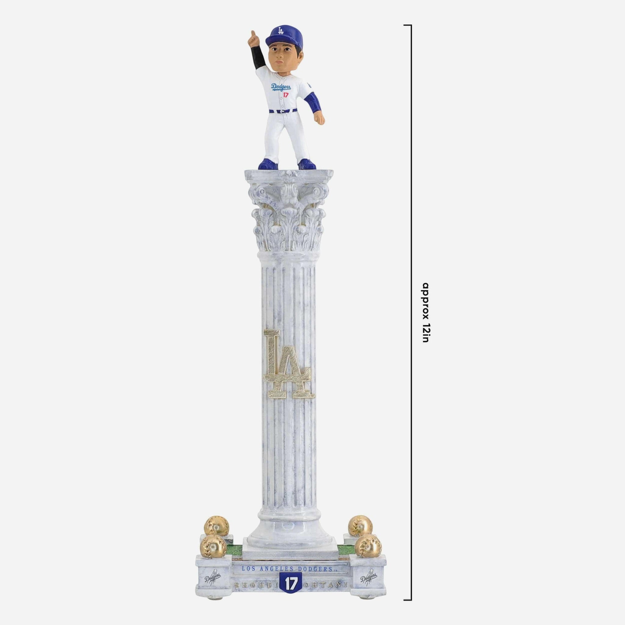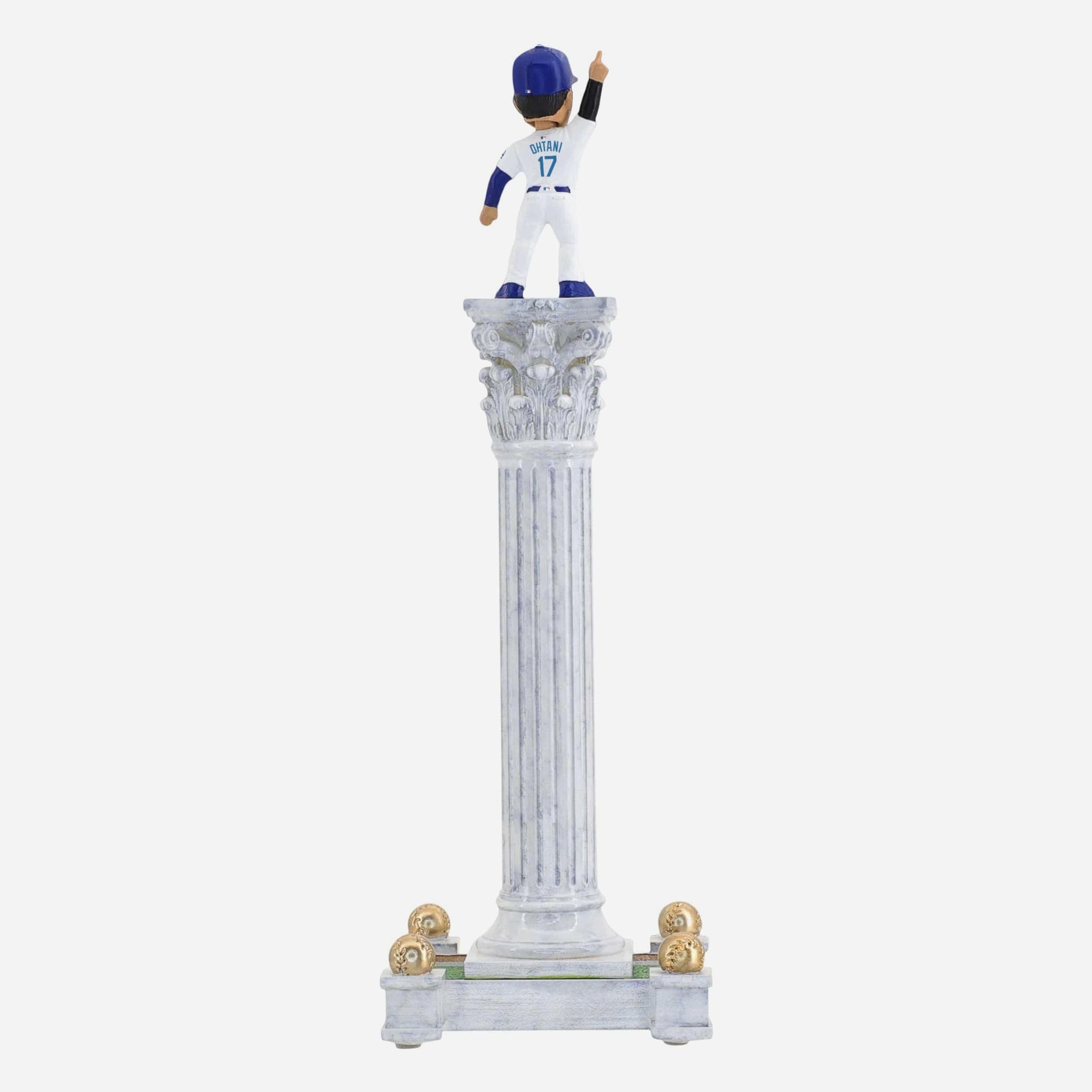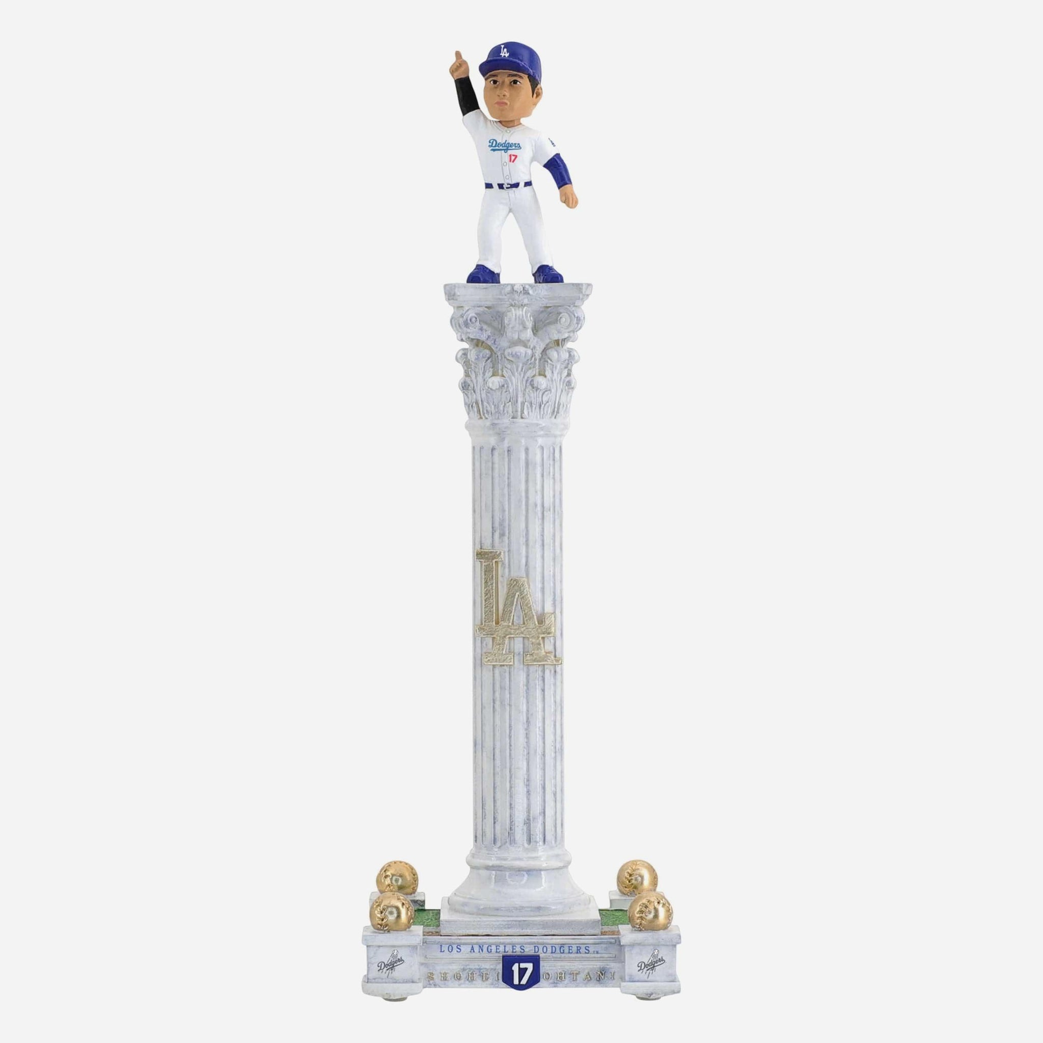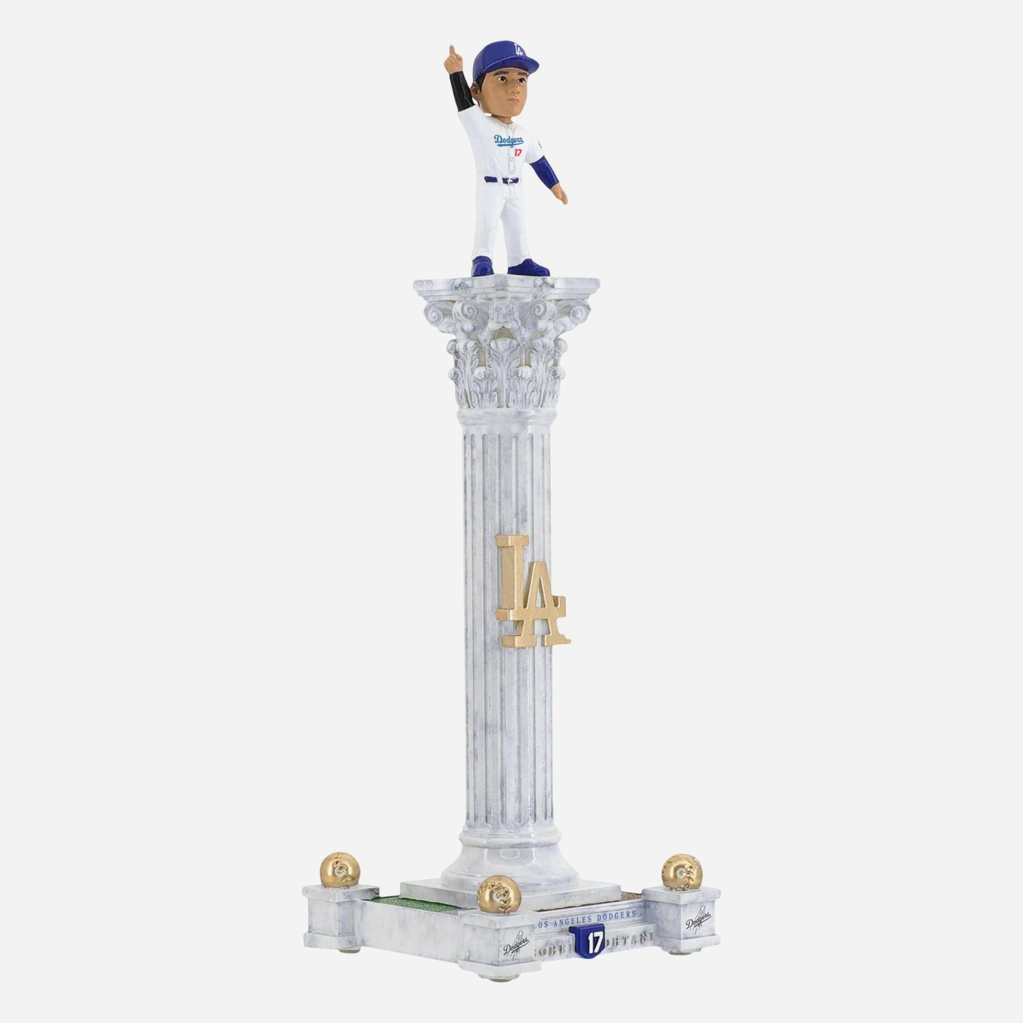 • Portrays Shohei Ohtani wearing his Los Angeles Dodgers gameday uniform, posed atop a dramatic tall pedestal
