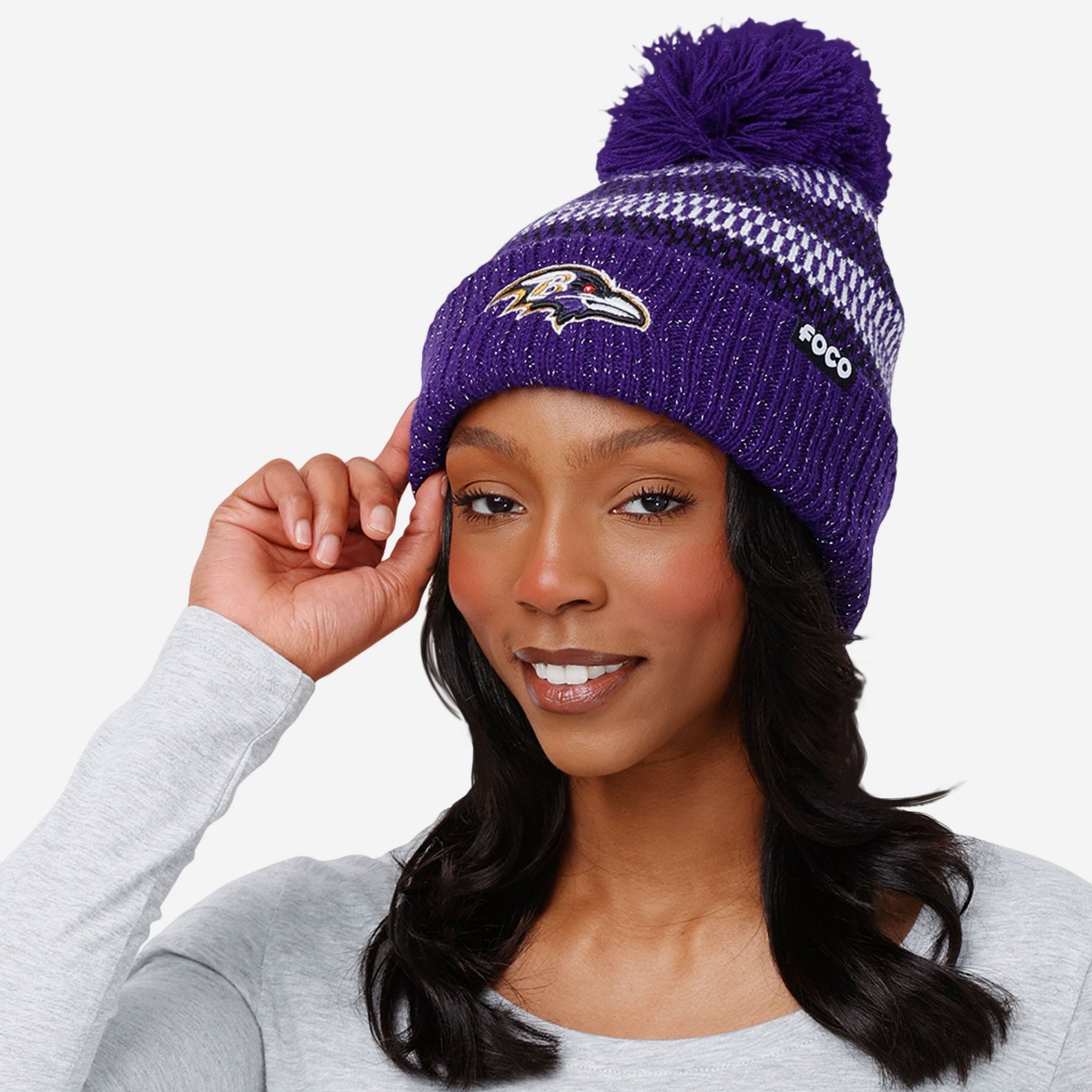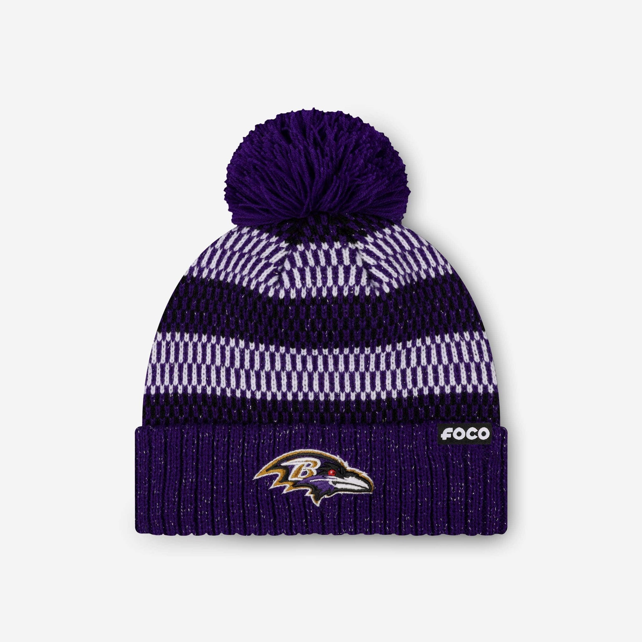 Putting together the ultimate fit for the tailgate and beyond? Make sure to get your head in the game with the Baltimore Ravens Women's Cozy Knit Metallic Thread Pom Beanie!