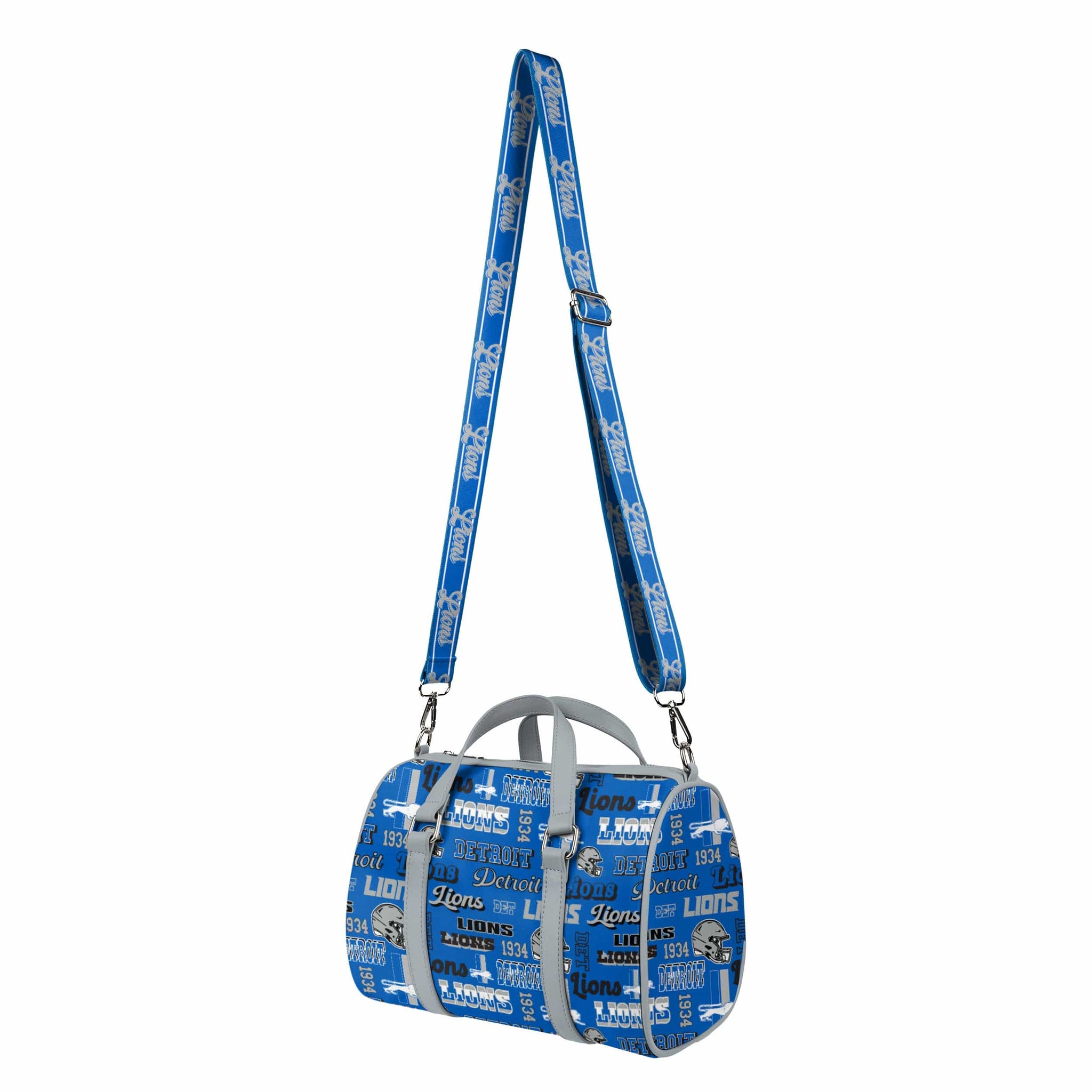 Pack up and play on! Fashion meets fandom in the Detroit Lions Repeat Retro Print Nylon Medium Barrel Bag.