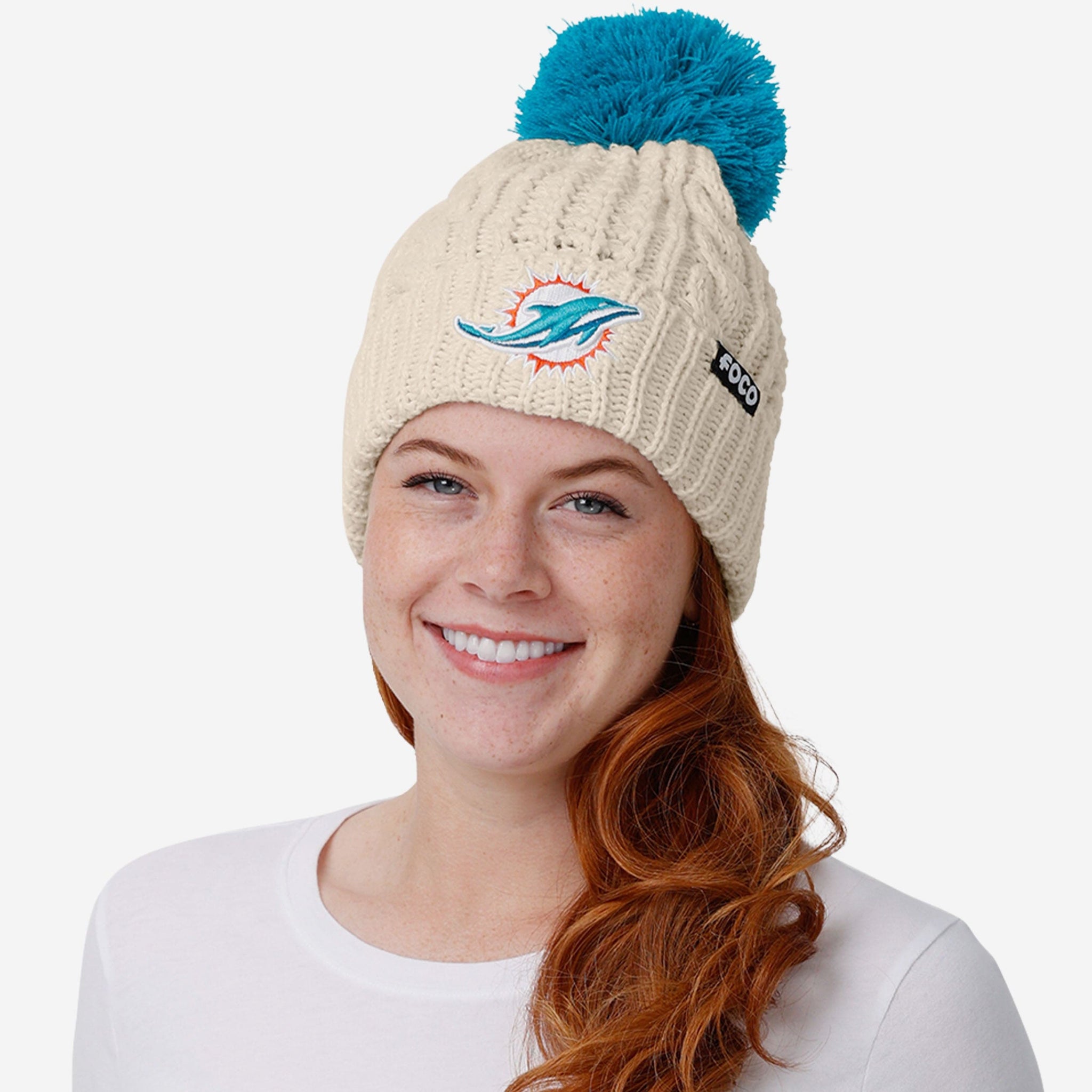 Putting together the ultimate fit for the tailgate and beyond? Make sure to get your head in the game with the Miami Dolphins Women's Primary Logo White Cable Knit Pom Beanie!