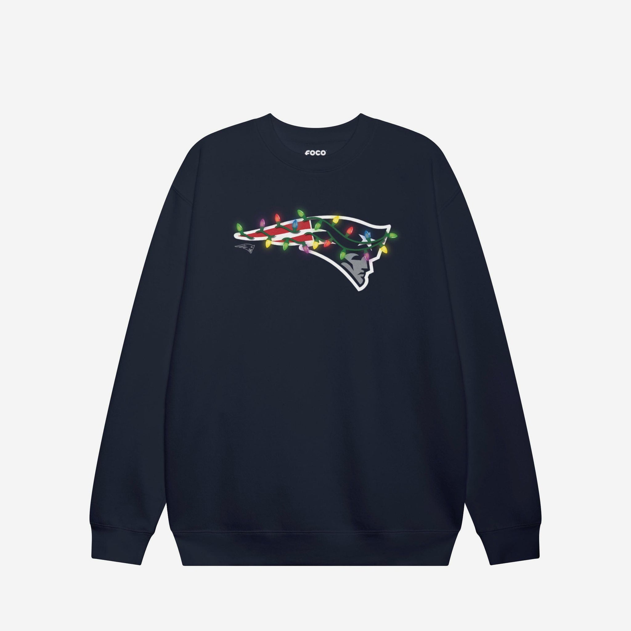 New England Patriots Primary Logo Holiday Lights Crew Neck Sweatshirt FOCO Black S - FOCO.com