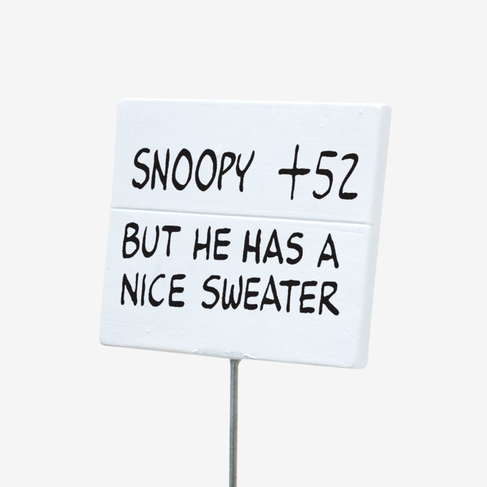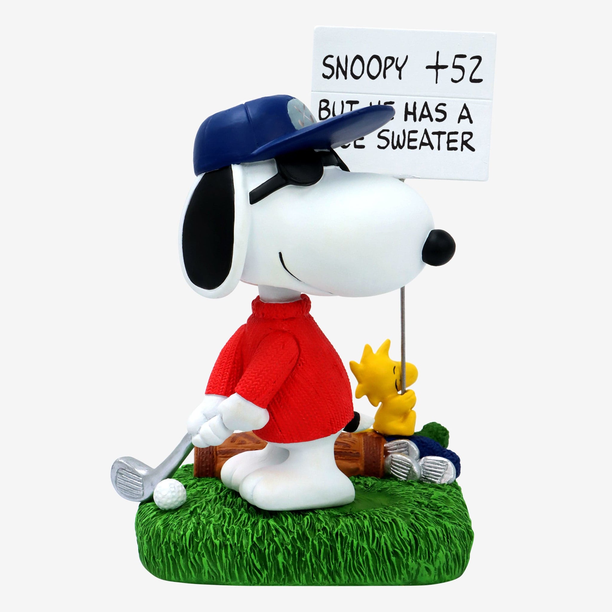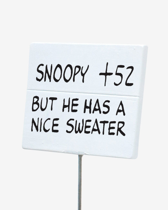 • Woodstock holding a sign with a “SNOOPY + 52 BUT HE HAS A NICE SWEATER” text display that will look great in your collection
