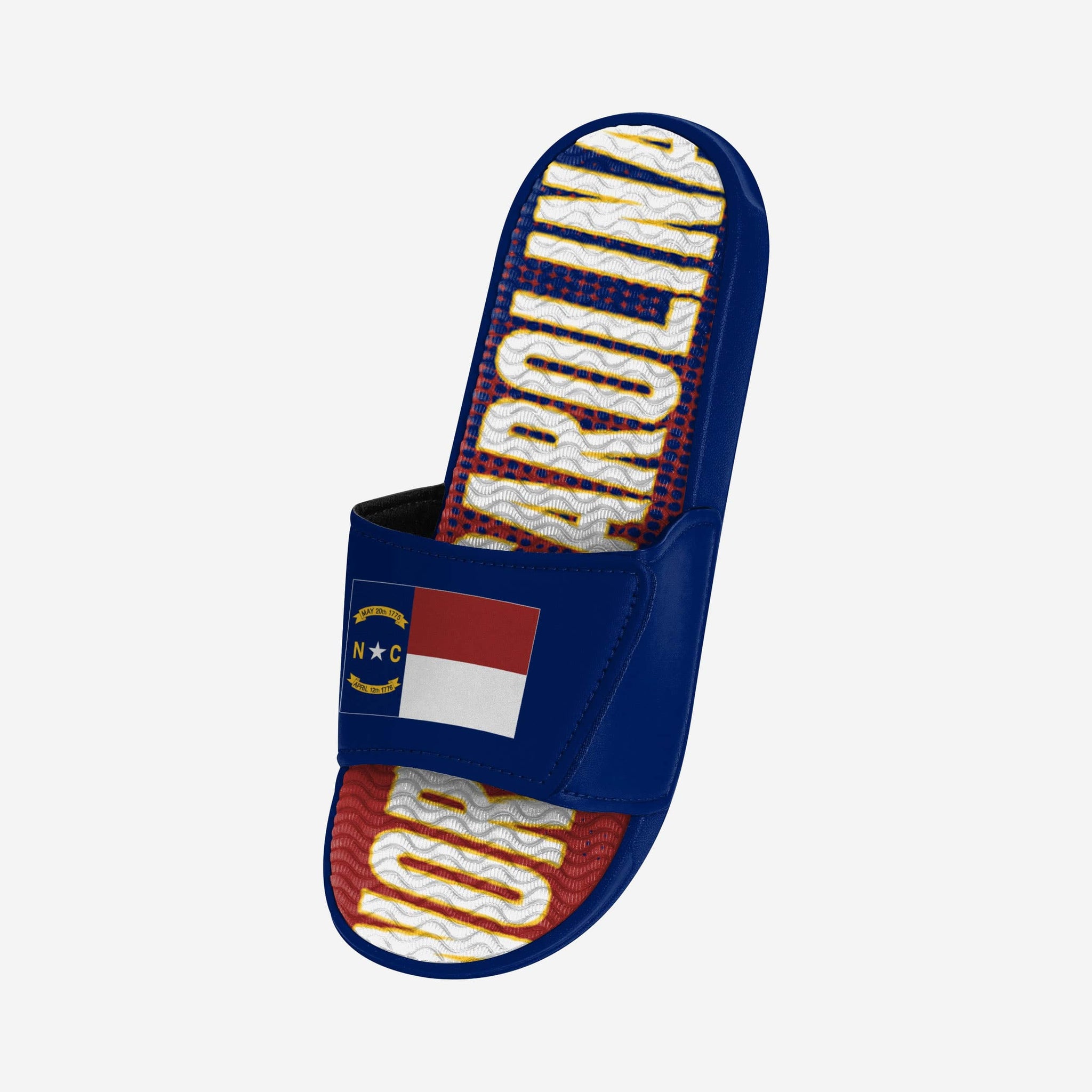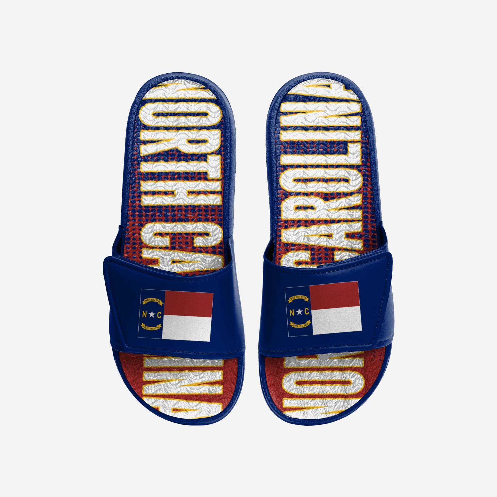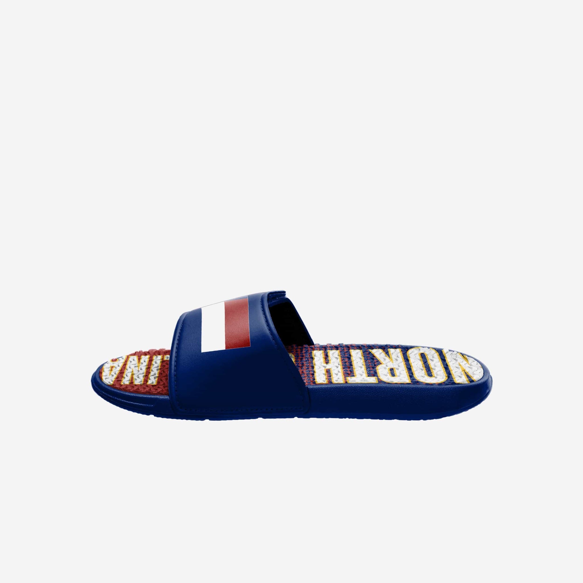 Add some team pride to your slides! Get to stepping and put the team on your back (and your feet) with these North Carolina Flag Gradient Wordmark Gel Slides.