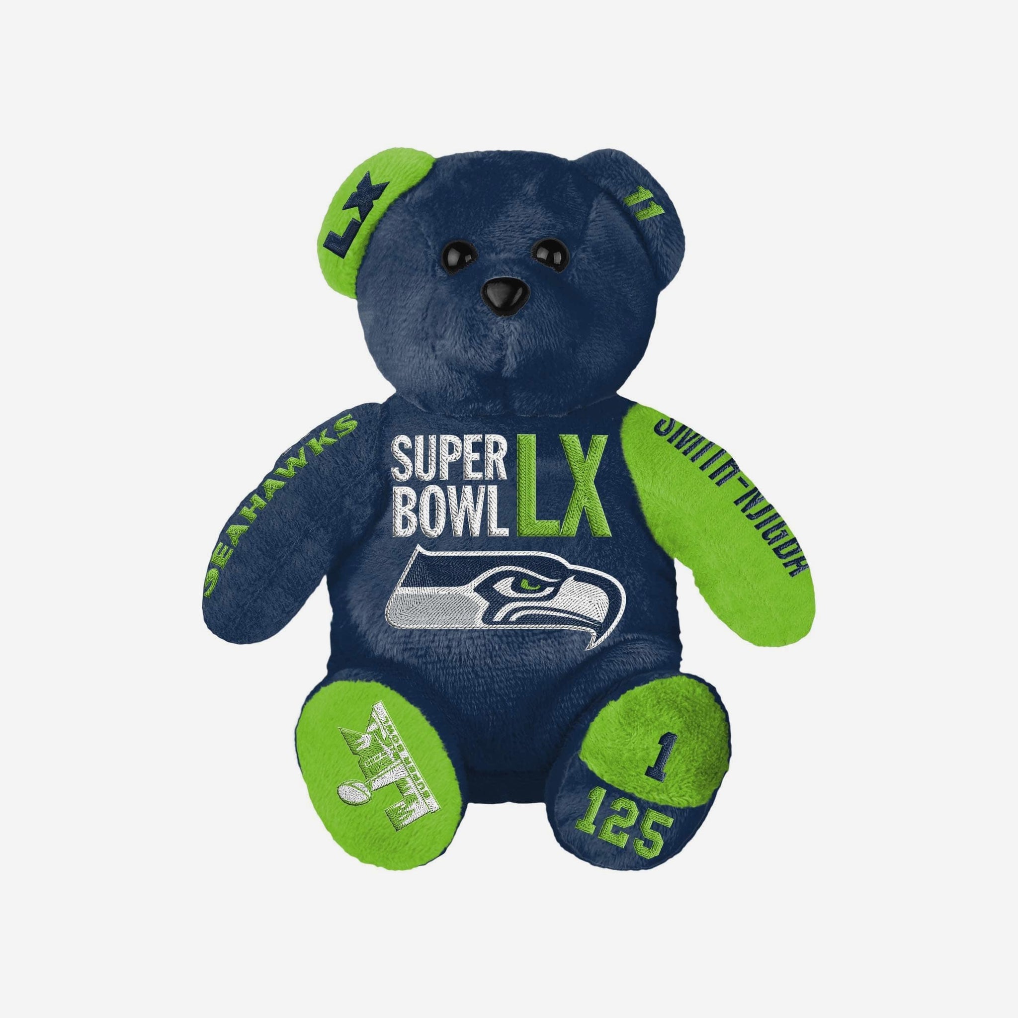 Cuddle up to Super Bowl excitement with this Jaxon Smith-Njigba Seattle Seahawks NFC Champions Super Bowl LX Bound Embroidered Bear. Designed to celebrate a historic run and unforgettable moments, this plush bear is the perfect way to show off your team pride in collectible form.