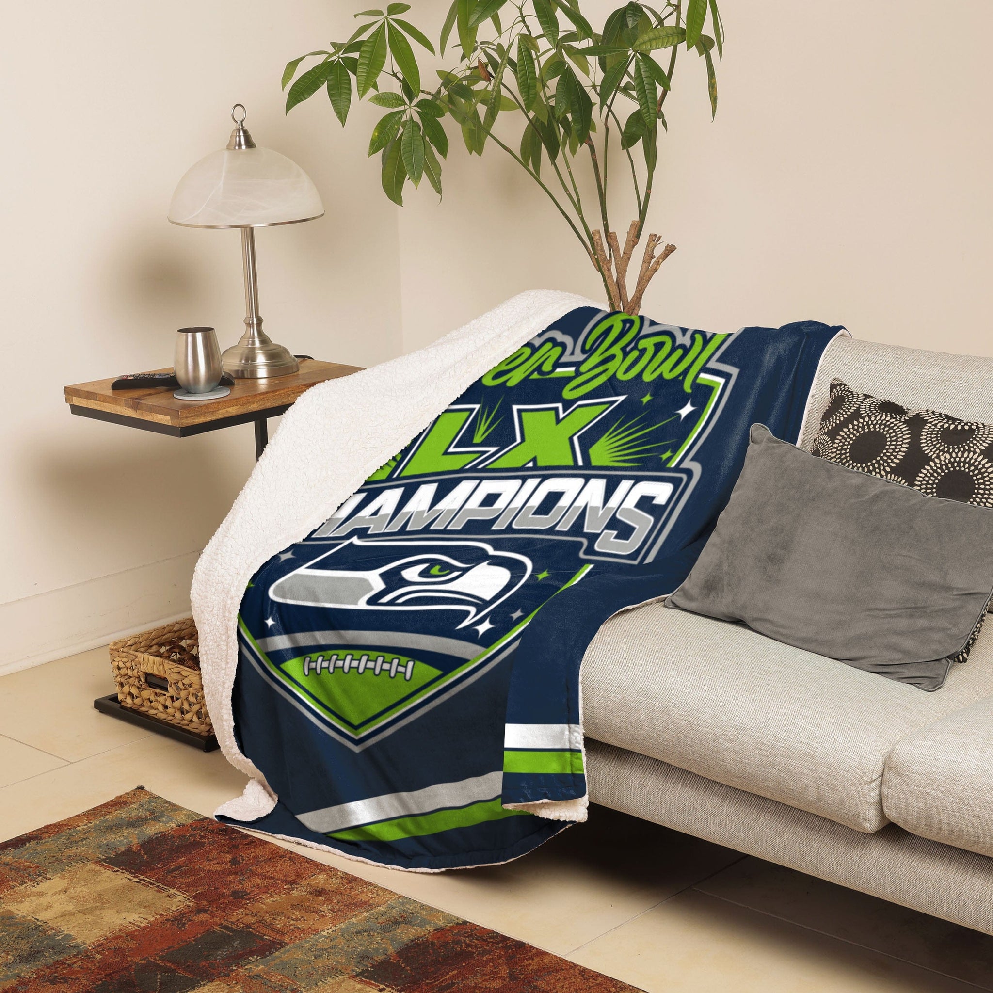 Now this is what we call championship-caliber blanket coverage. Rest up after the big win under this Seattle Seahawks Super Bowl LX Champions Blanket With Sherpa.