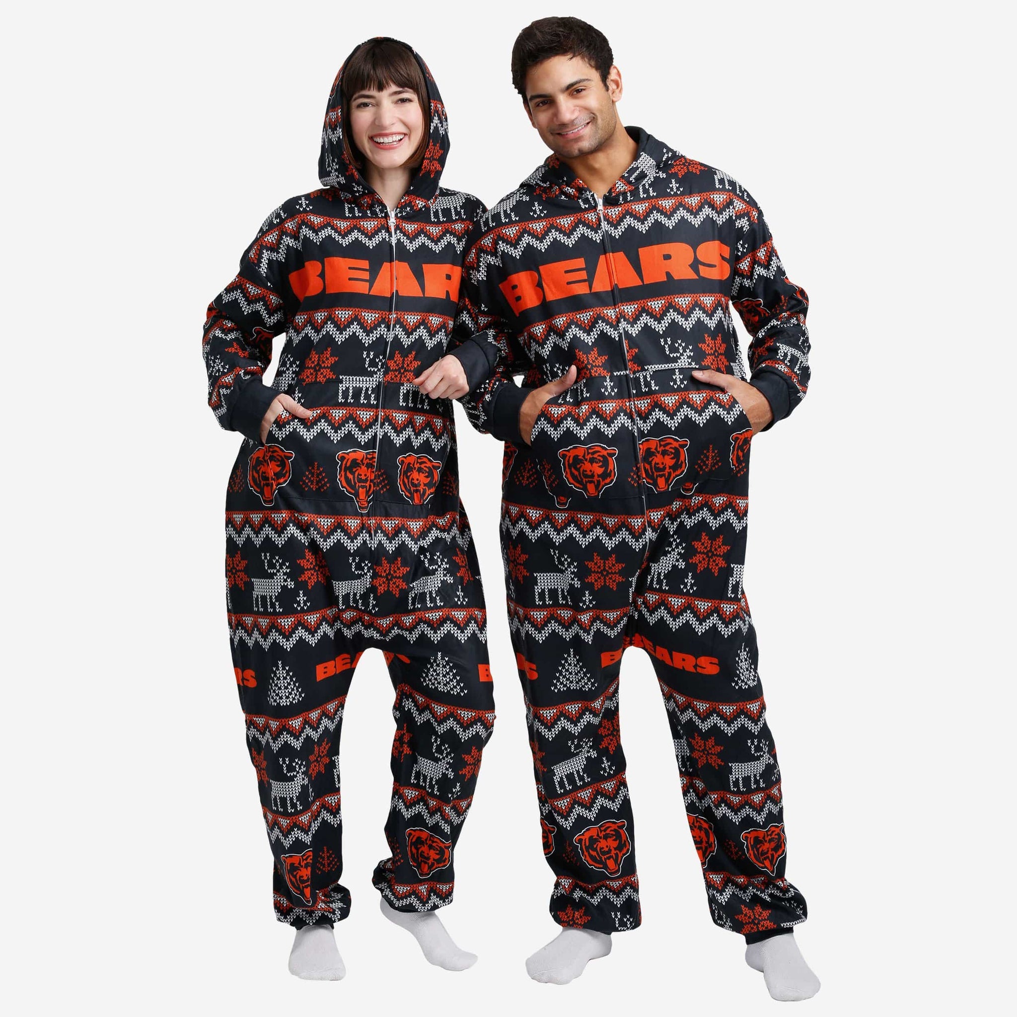 Get some matching family pajamas and dress to impress this holiday season! You won't want to miss these onesie team pajamas! These men's and women's PJ's are comfortable and show off your team spirit in the form of some sweet one piece jammies. Introducing the Chicago Bears Ugly Pattern One Piece Pajamas! Don't forget to take your holiday photo with the whole family wearing matching Christmas pajamas!