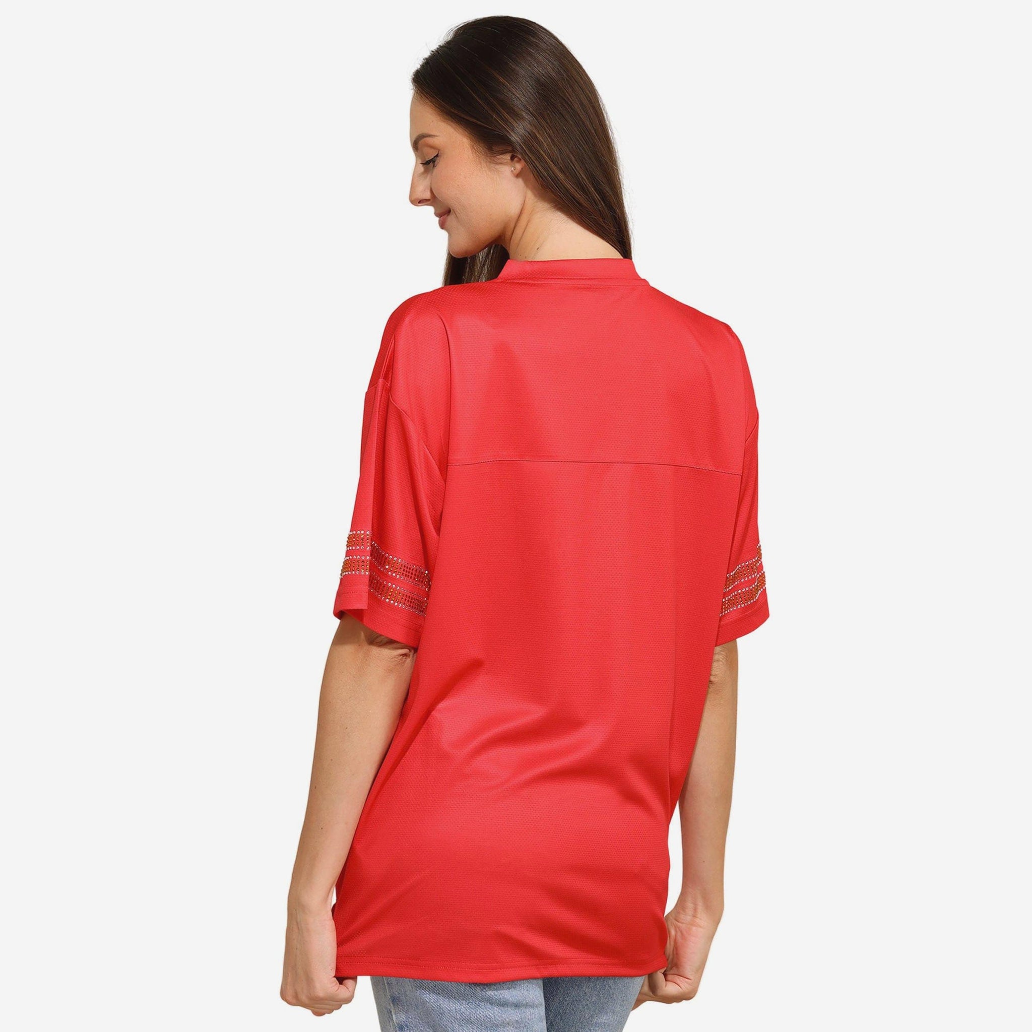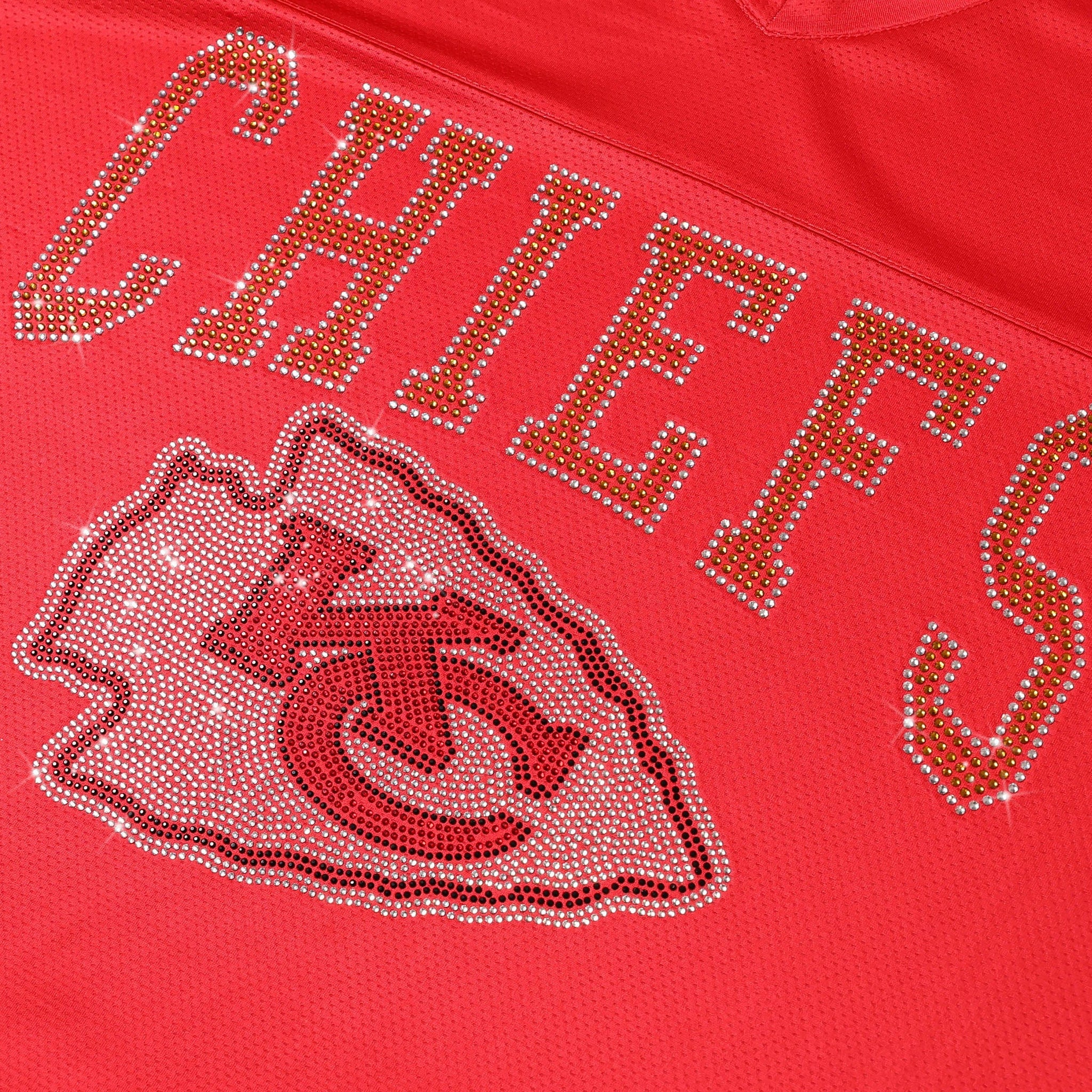 Bring the energy and let your team pride shine. The Kansas City Chiefs Womens Rhinestone Logo Oversized V-Neck Mesh T-Shirt is built for fans who want to stand out while staying comfortable. With a breathable jersey mesh build, bold rhinestone team graphics, and a relaxed oversized fit, this tee is ready for game day, gym sessions, or just repping your squad on the go.