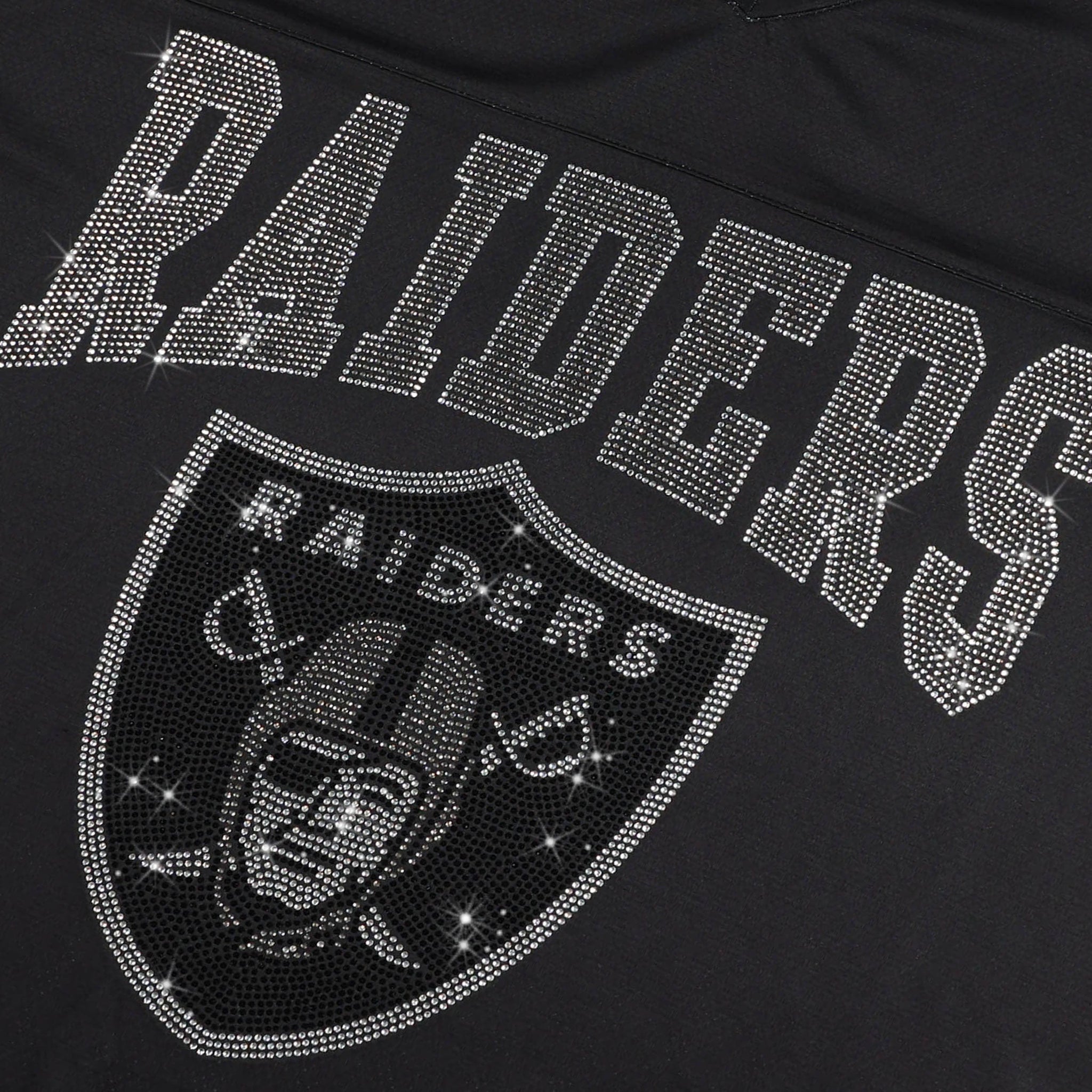 Bring the energy and let your team pride shine. The Las Vegas Raiders Womens Rhinestone Logo Oversized V-Neck Mesh T-Shirt is built for fans who want to stand out while staying comfortable. With a breathable jersey mesh build, bold rhinestone team graphics, and a relaxed oversized fit, this tee is ready for game day, gym sessions, or just repping your squad on the go.