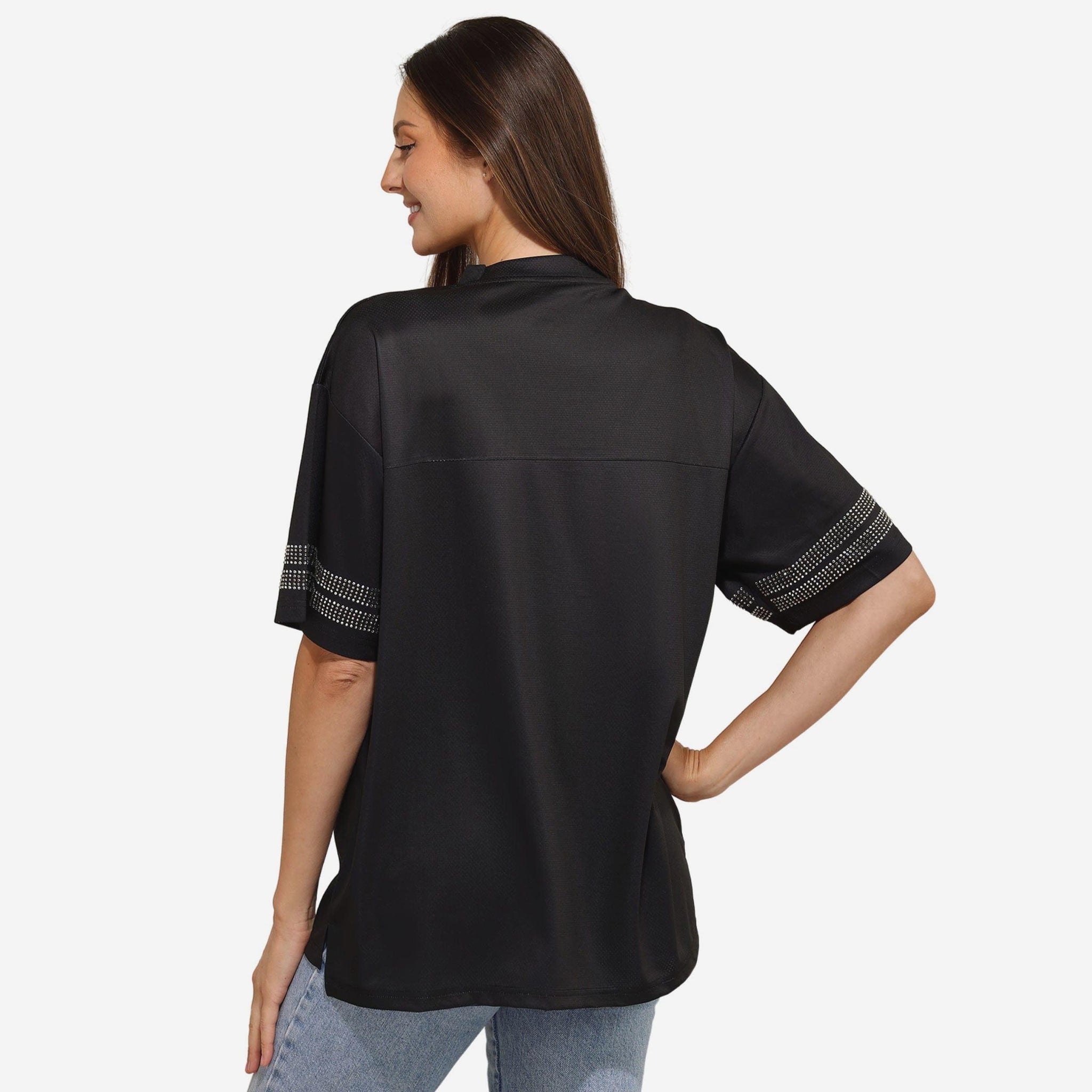 This v-neck mesh t-shirt is crafted from lightweight, 100% polyester for all-day comfort and breathability. The oversized silhouette gives you that effortlessly cool vibe, while the rhinestone team logo and name across the chest make sure everyone knows who you’re rooting for. It’s sporty, stylish, and totally team chic.