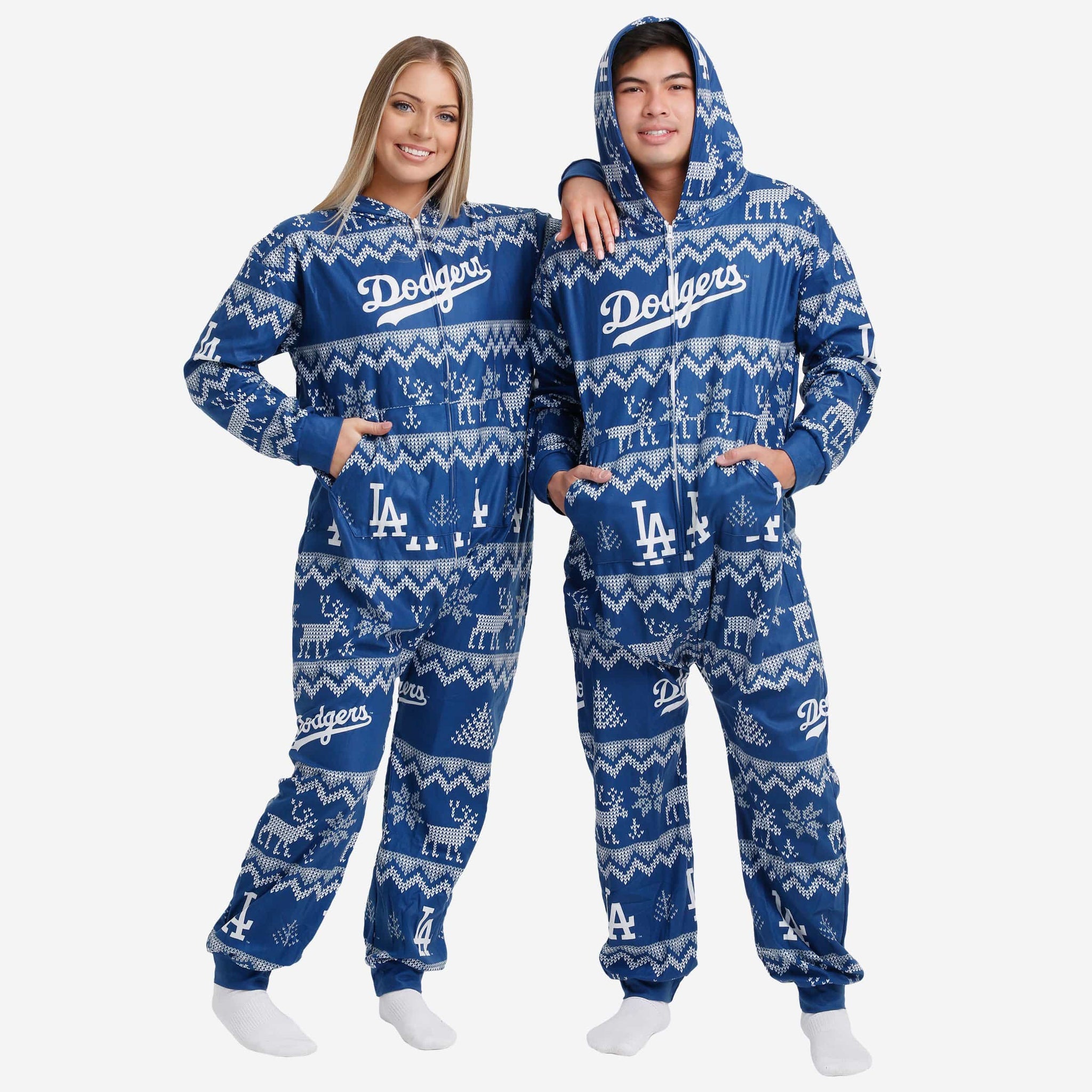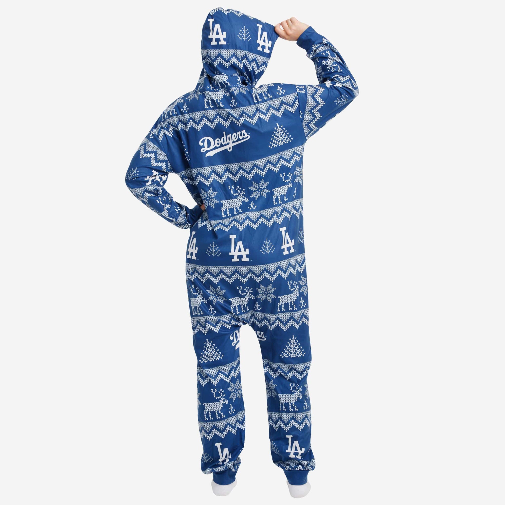 Get some matching family pajamas and dress to impress this holiday season! You won't want to miss these onesie team pajamas! These men's and women's PJ's are comfortable and show off your team spirit in the form of some sweet one piece jammies. Introducing the Los Angeles Dodgers Ugly Pattern One Piece Pajamas! Don't forget to take your holiday photo with the whole family wearing matching Christmas pajamas!