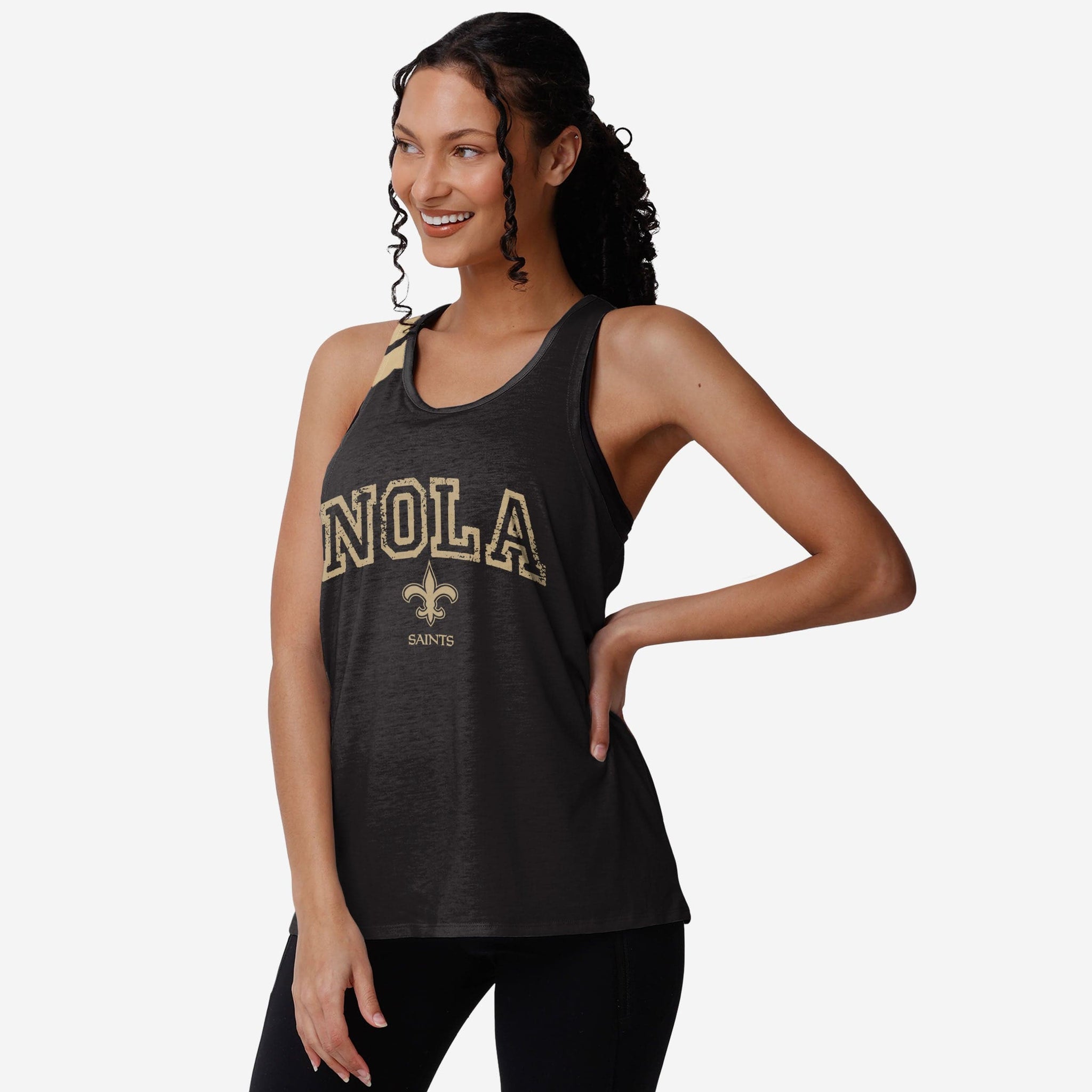 Get ready to flex your fan muscles, with a twist. Literally. This New Orleans Saints Women's Team Twist Sleeveless Top shows off your team spirit and will have you looking good at the beach, in the gym, or wherever else you feel like showing everyone what a true fan looks like.