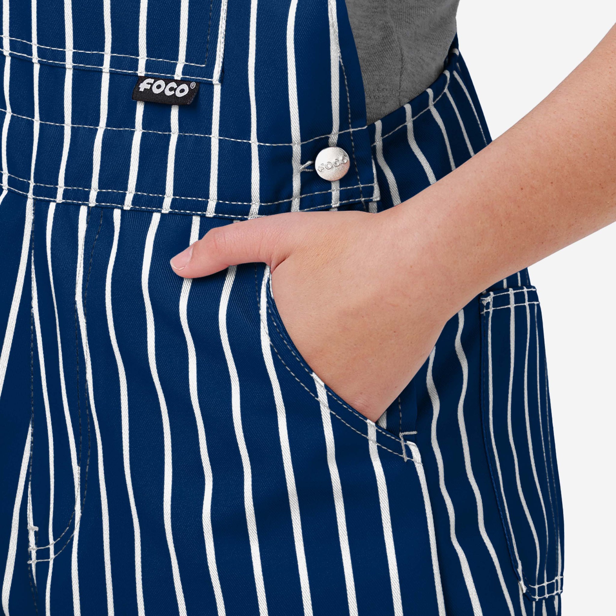 The bib pocket is perfect for storing your phone, makeup, jewelry, skincare products, fragrances, or other essentials, and the adjustable bib shoulder straps ensure a comfortable fit. Two back pockets provide even more storage space. These shortalls are made of sturdy and functional woven polyester canvas that is lightweight and breathable. They provide coverage and durability, so you can focus on cheering on your team without worrying about your outfit. This pinstripe style is so perfect for gameday that there's a good chance you'll be on the receiving end of a whole lot of postgame high fives and fist bumps, because your fellow fans will deem you the star of the game, responsible for every big play.