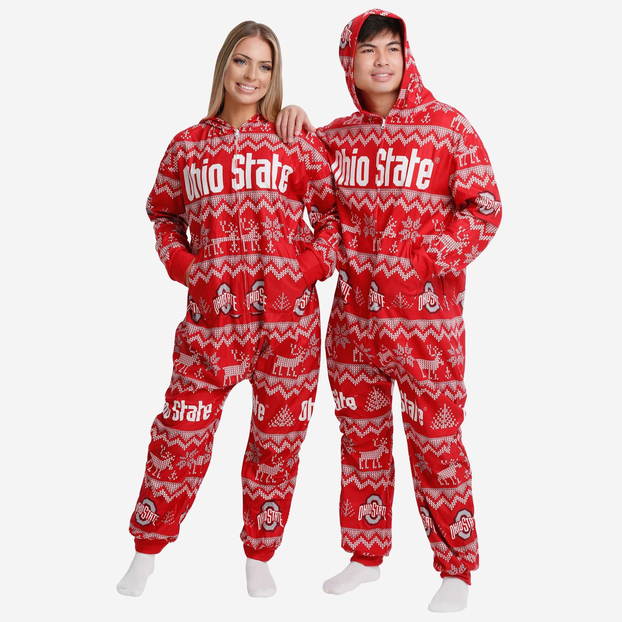 Get some matching family pajamas and dress to impress this holiday season! You won't want to miss these onesie team pajamas! These men's and women's PJ's are comfortable and show off your team spirit in the form of some sweet one piece jammies. Introducing the Ohio State Buckeyes Ugly Pattern One Piece Pajamas! Don't forget to take your holiday photo with the whole family wearing matching Christmas pajamas!