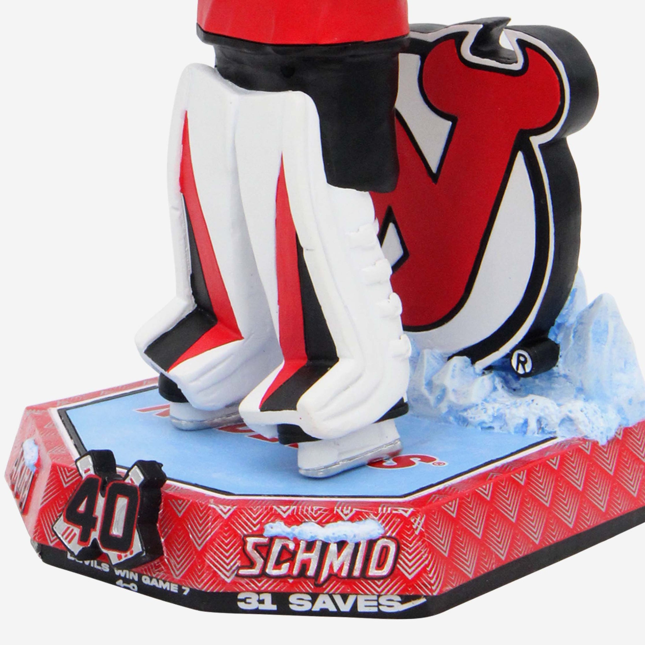 - “5TH ROOKIE TO POST SHUTOUT IN A GAME 7 IN LEAGUE HISTORY”, “DEVILS WIN GAME 7 4-0”, and “31 SAVES” text displays on front of base to immortalize Schmid's incredible performance
