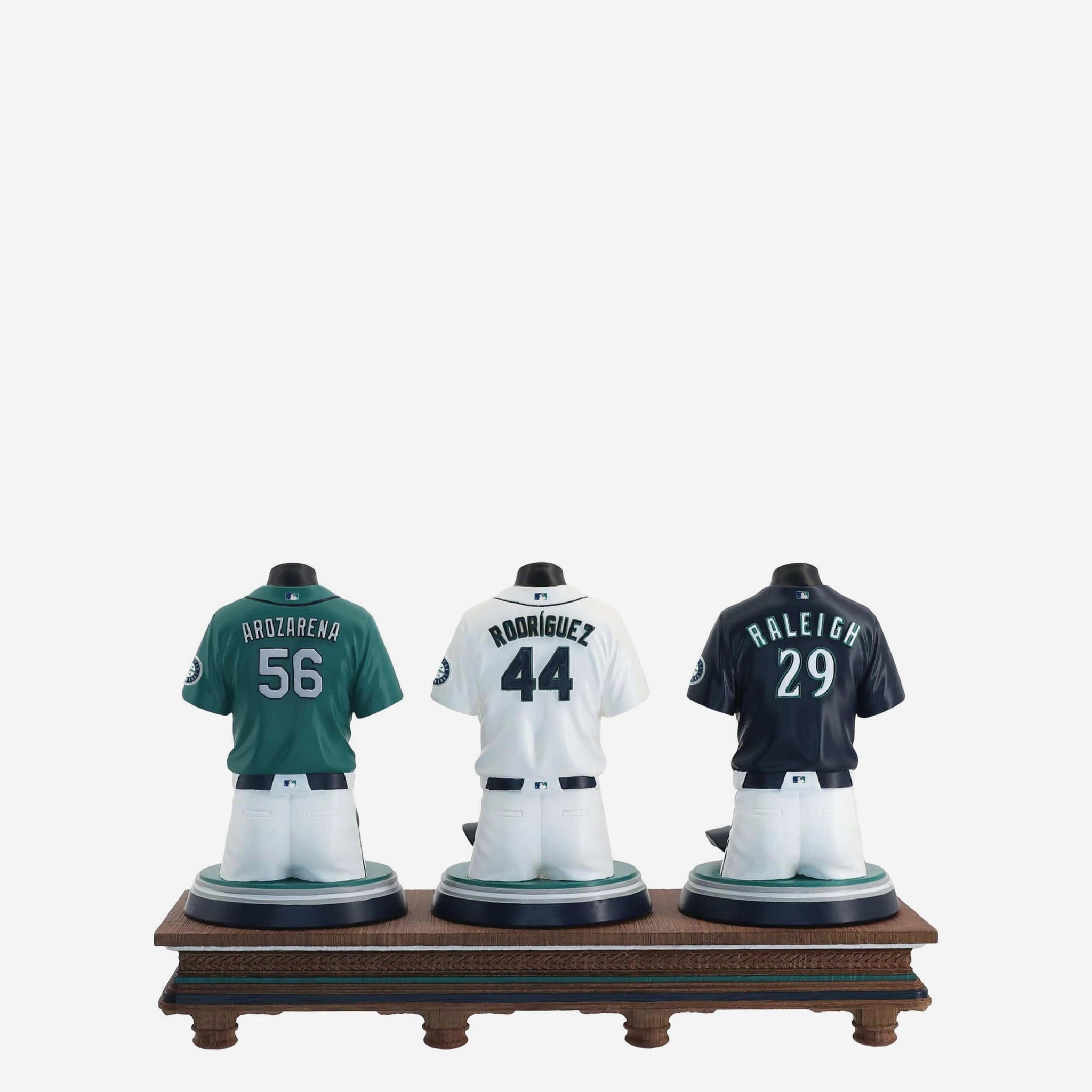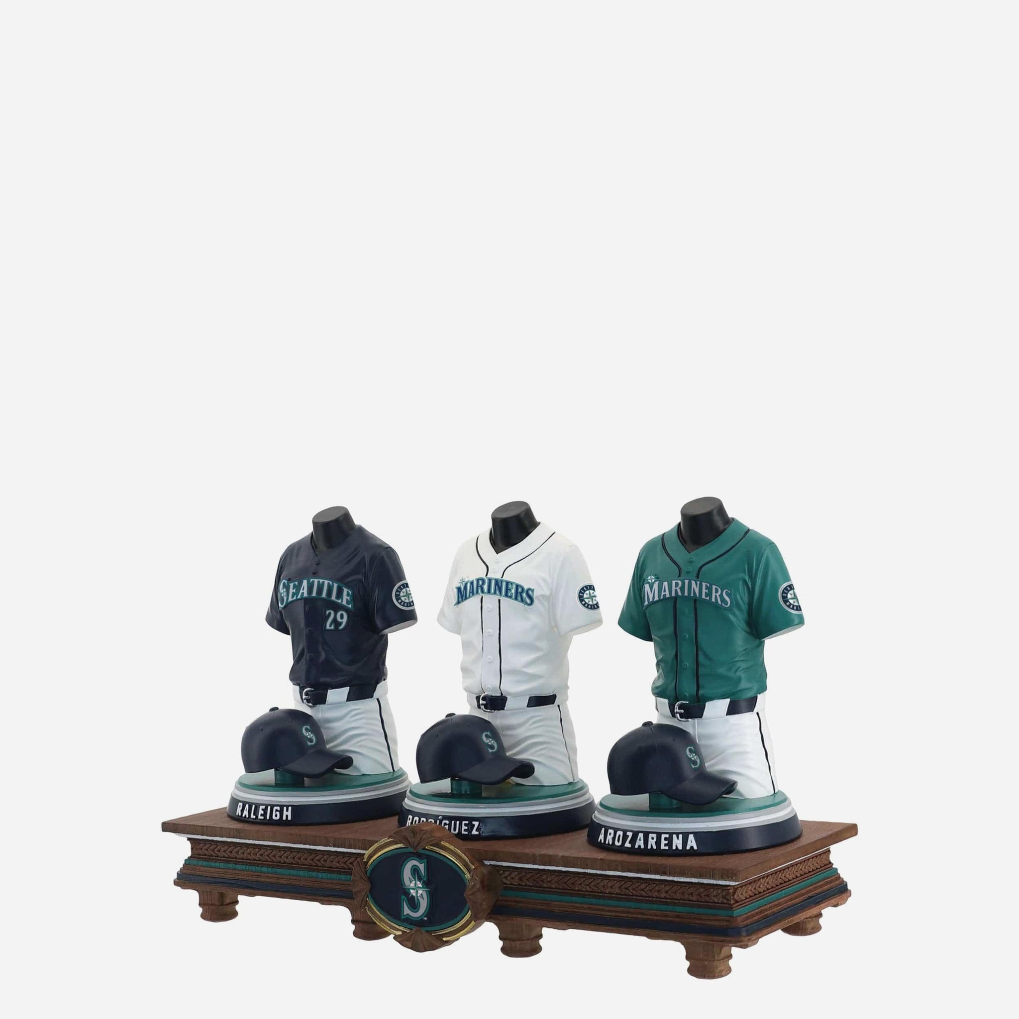 • Portrays Cal Raleigh, Julio Rodríguez, and Randy Arozarena player jersey busts with matching caps, combining for one epic display of team spirit
