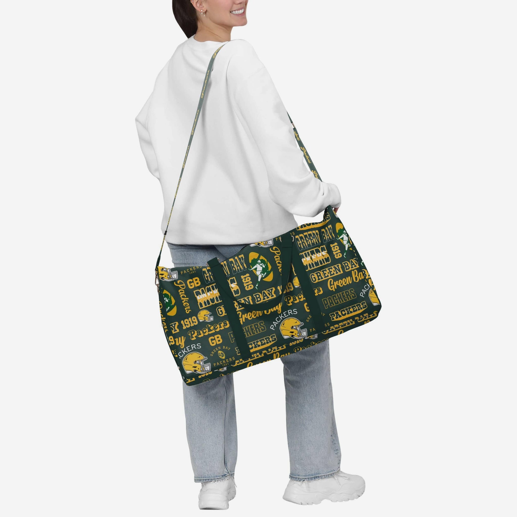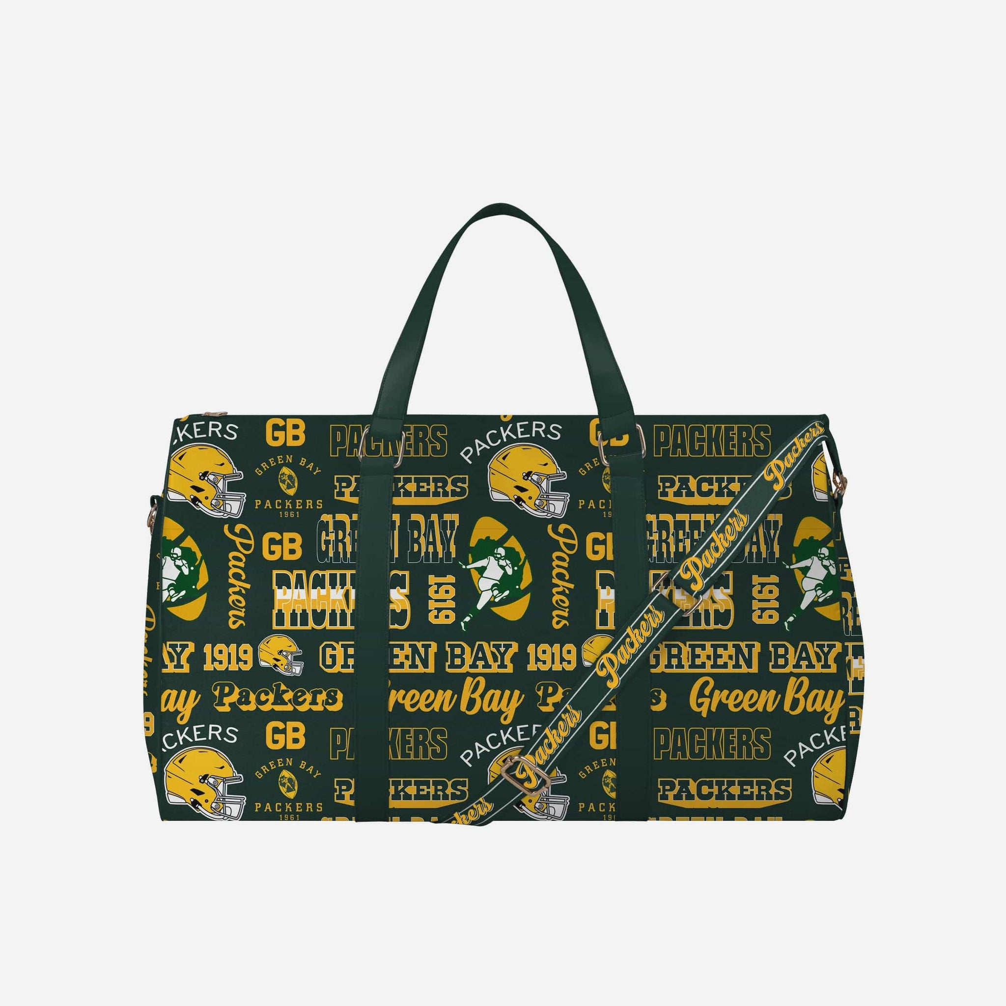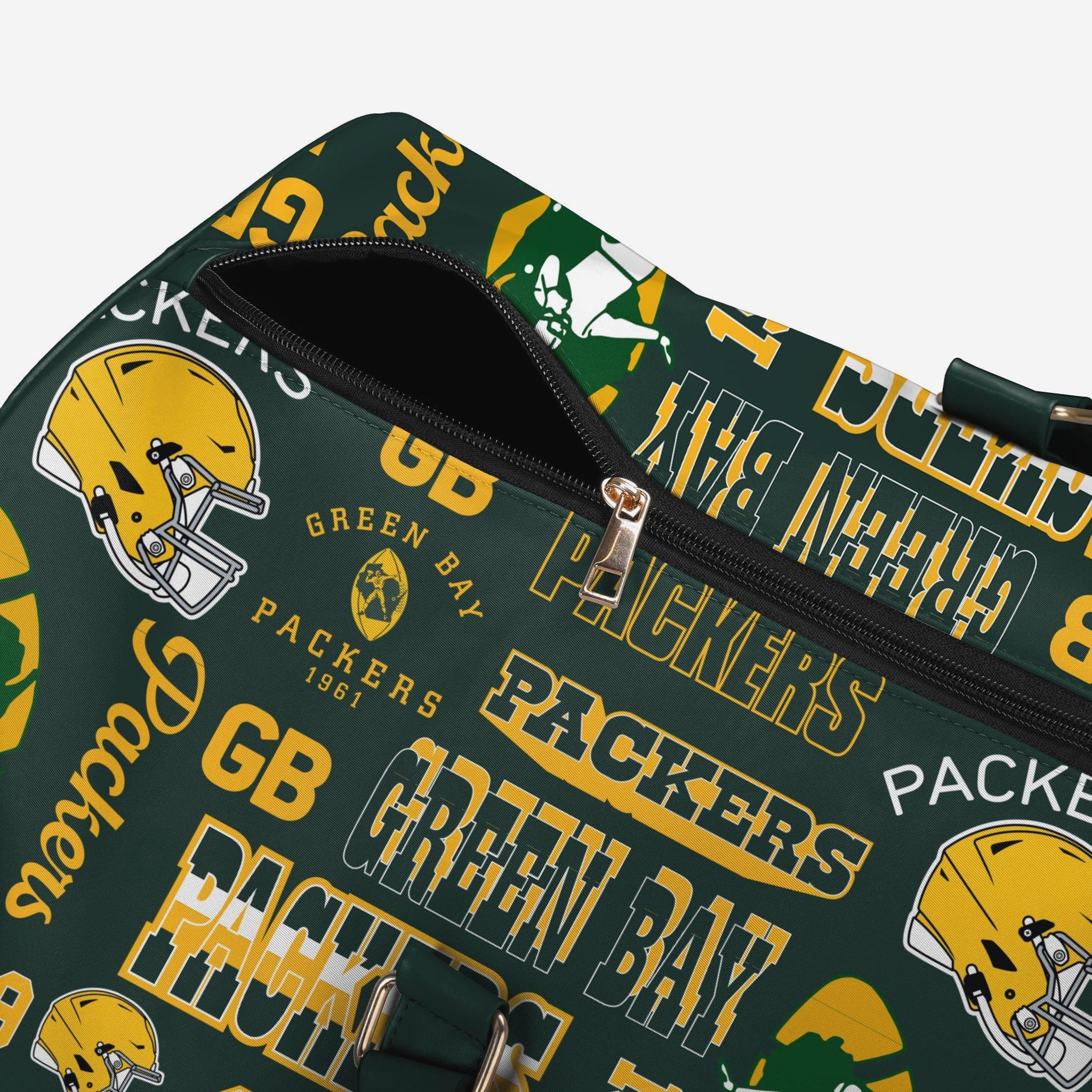 • Repeat retro Green Bay Packers wordmarks, logos, and graphics printed all over the bag so your team pride is always on display