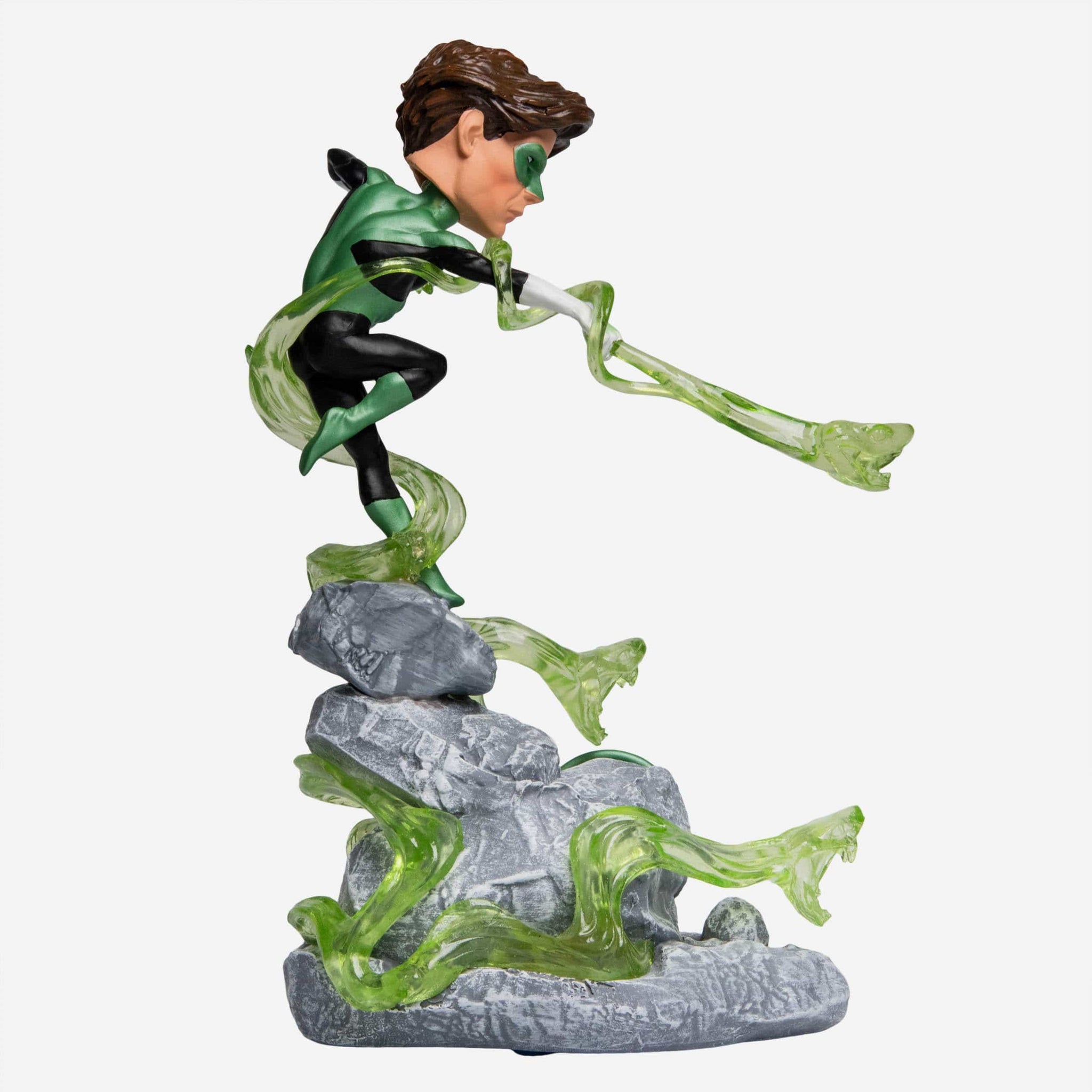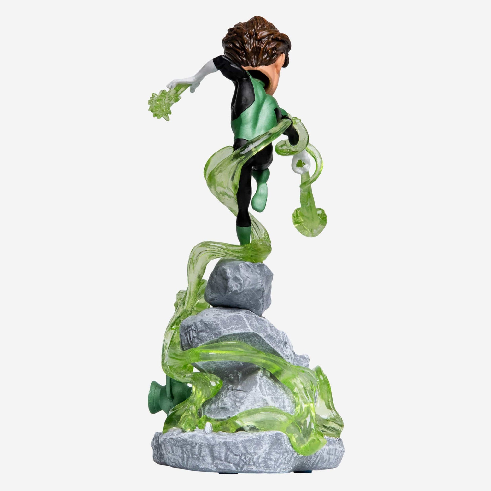 - Portrays Green Lantern in an action pose above textured rock backdrop, getting ready to save the world again