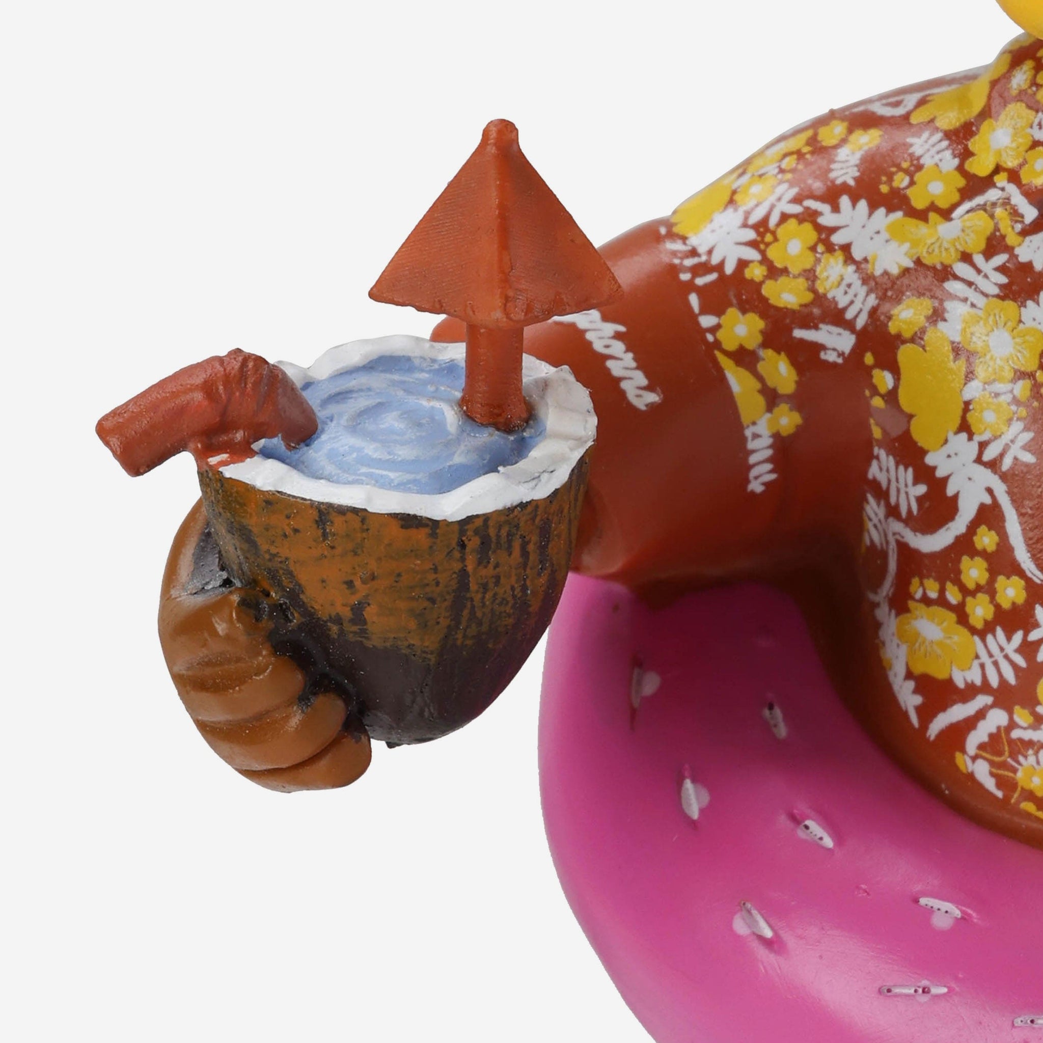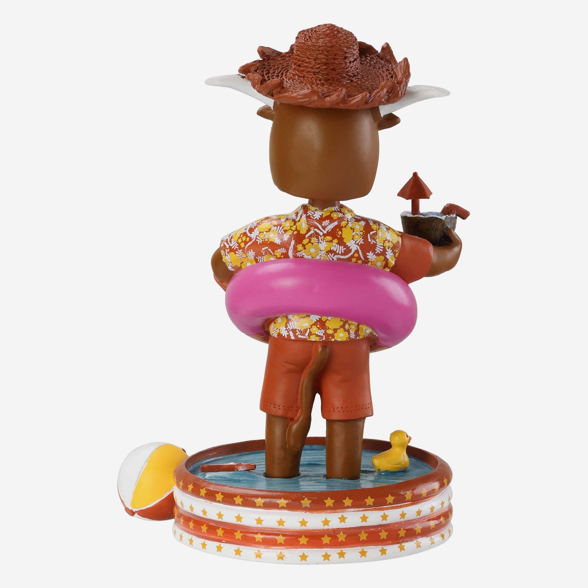 - Portrays mascot standing in a team-colored inflatable pool, posing in a tube and holding a coconut drink, ready to stay cool by the pool