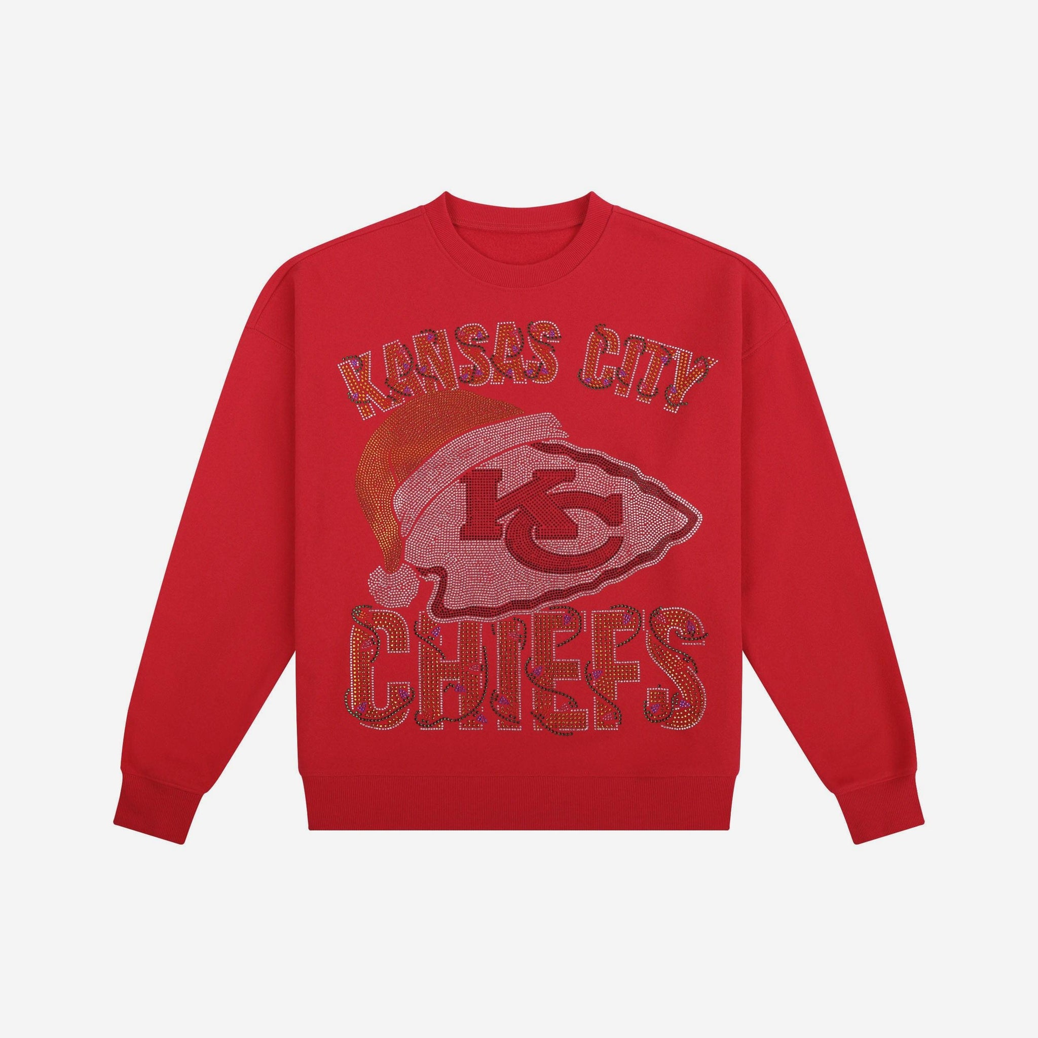 Santa's making a list, and he’s checking it twice! Bling it on! It's time to turn up the twinkle and let your fan fit do the talking. This Kansas City Chiefs Womens Rhinestone Logo Oversized Holiday Crew Neck Sweatshirt is made for those who like their cozy with a little extra shine. From game day to every day, it’s the perfect way to stay warm and wow-worthy during the holiday season.