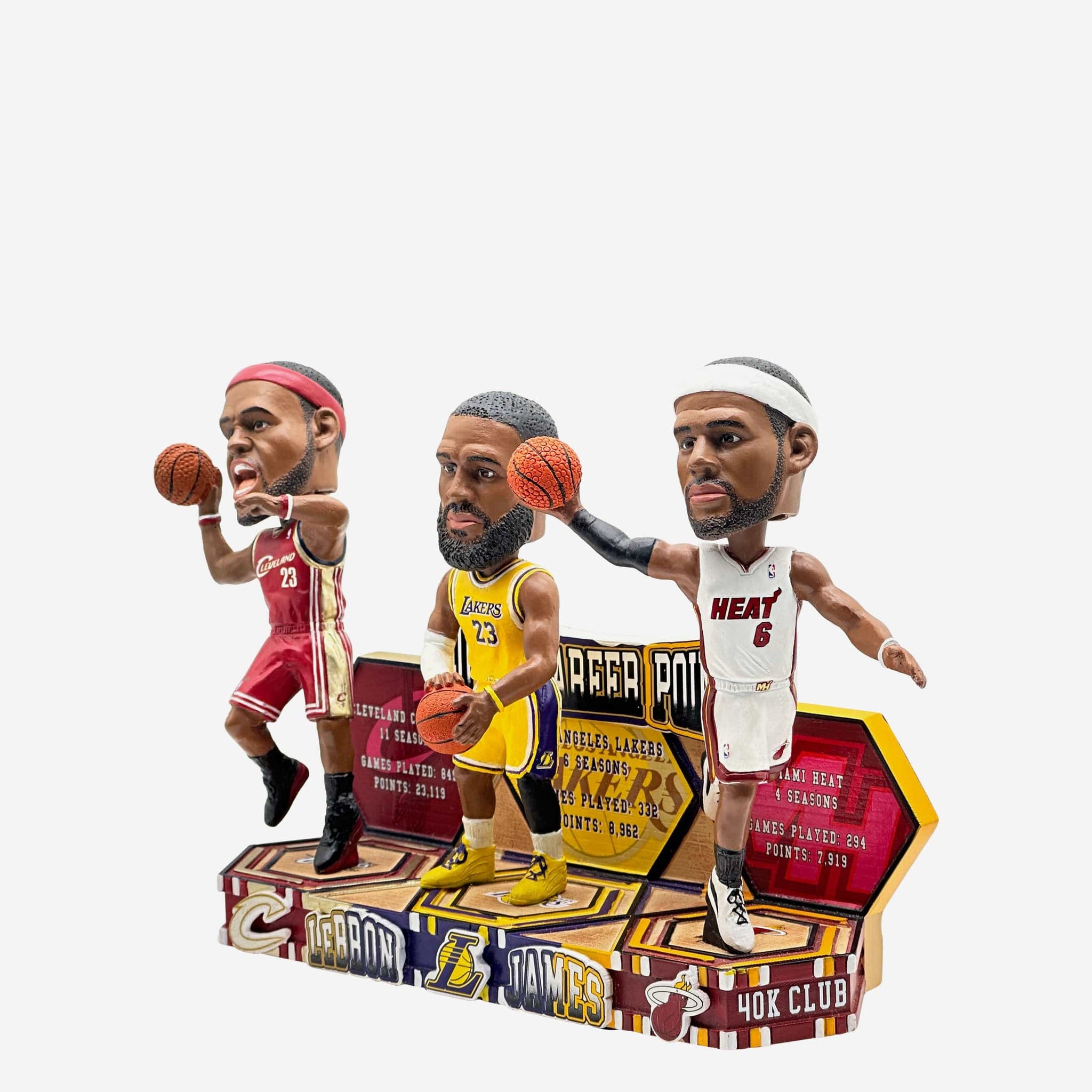 40,000 points. Three teams. One king. Celebrate this legendary milestone with the LeBron James Los Angeles Lakers & Cleveland Cavaliers & Miami Heat 40,000 Points Milestone Mini Bobblehead Scene.