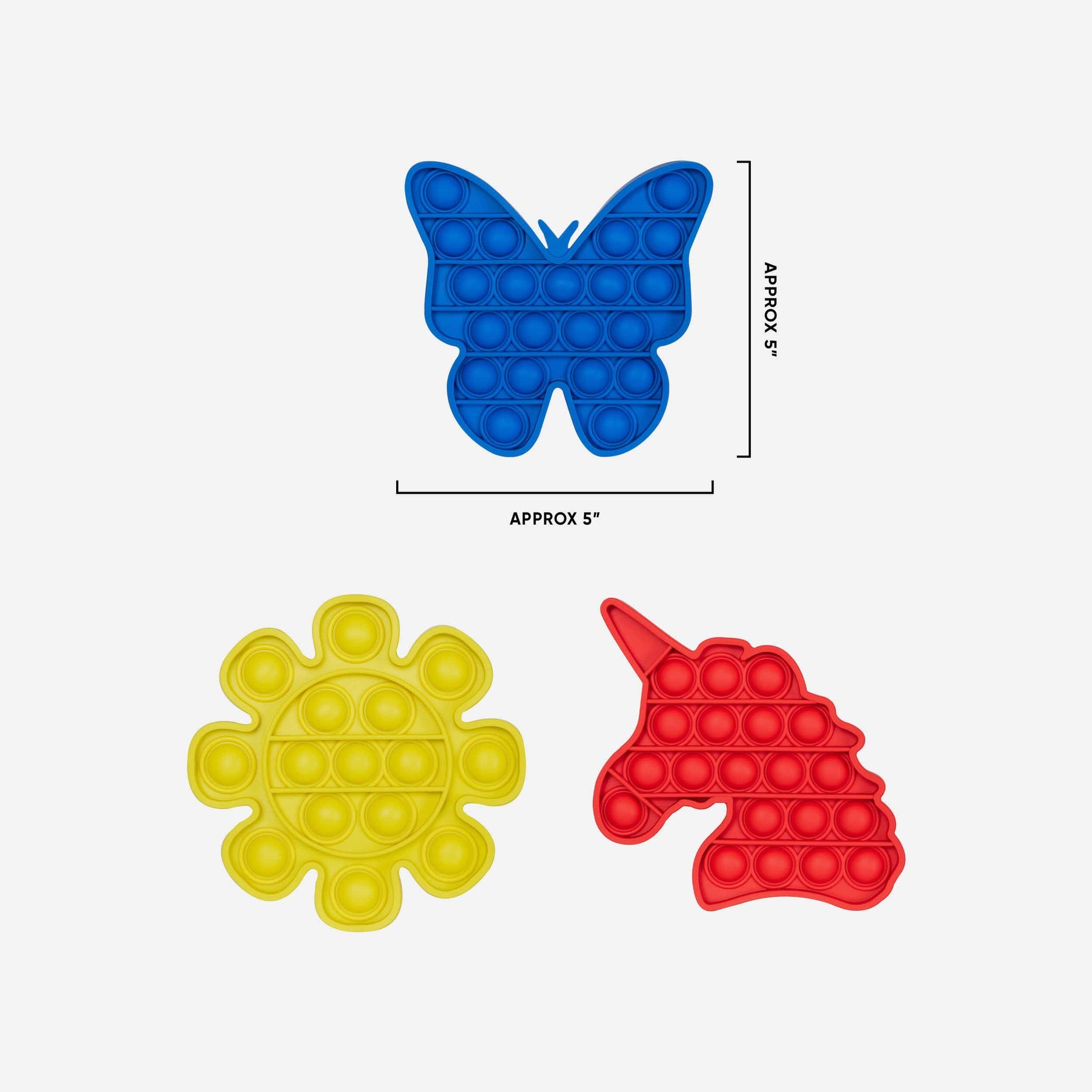 - Three-pack of vibrant colored fidget popper toys in fun shapes that will put a smile on any face