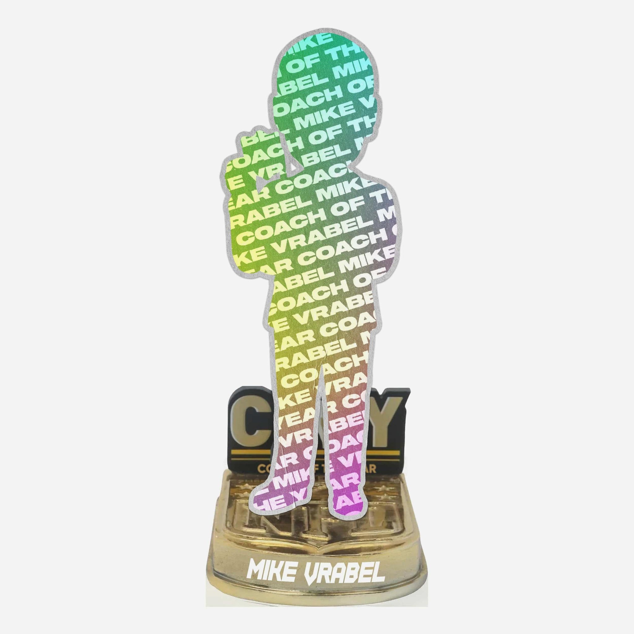 • Portrays the Coach of the Year posing in a suit and holding a trophy, showing off some hard-earned hardware