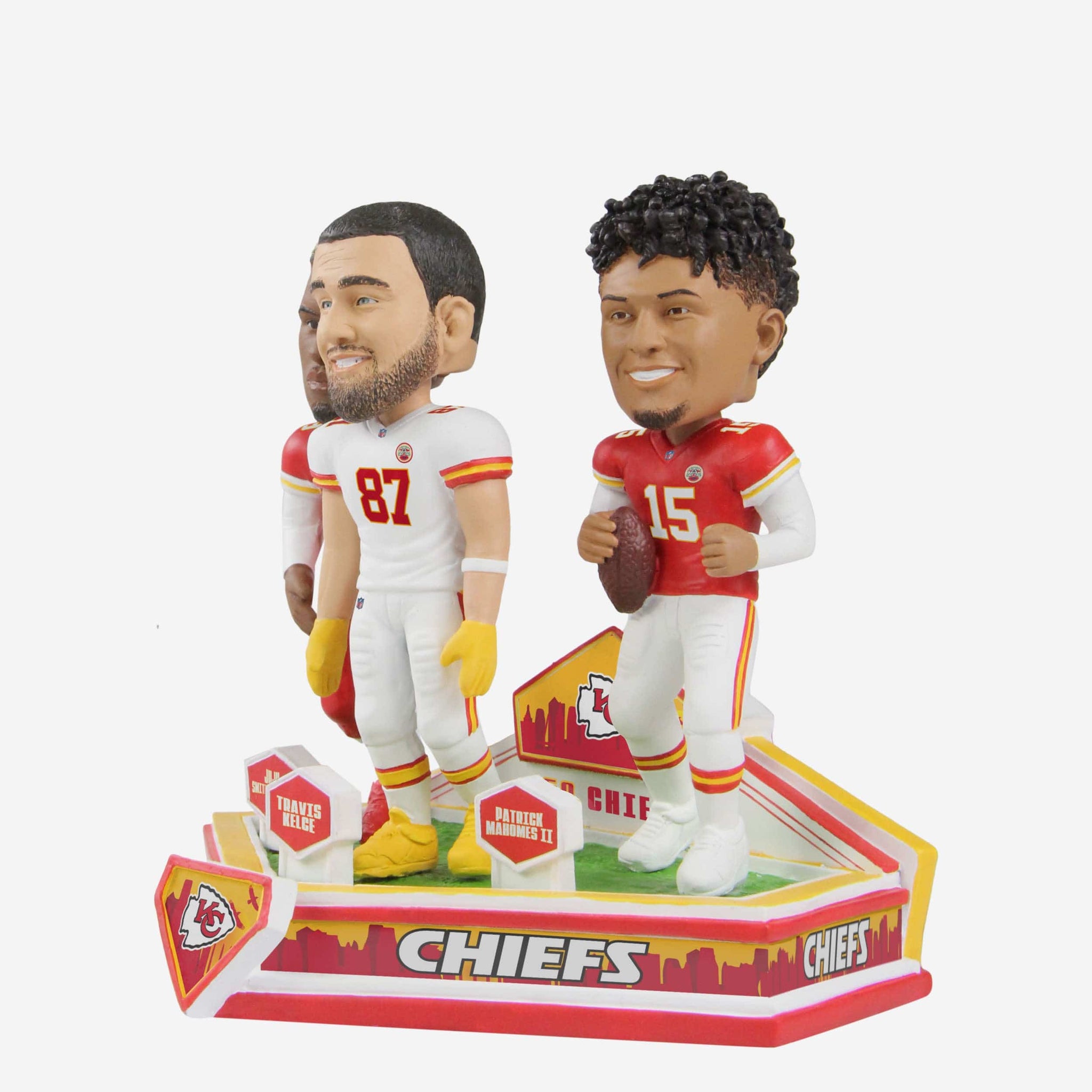 Whether you're making Mahomes magic, catching a TD with Travis, or just trying to bring some good JuJu to your collection, the Patrick Mahomes & Travis Kelce & JuJu Smith-Schuster Kansas City Chiefs Triple Bobblehead has you covered.