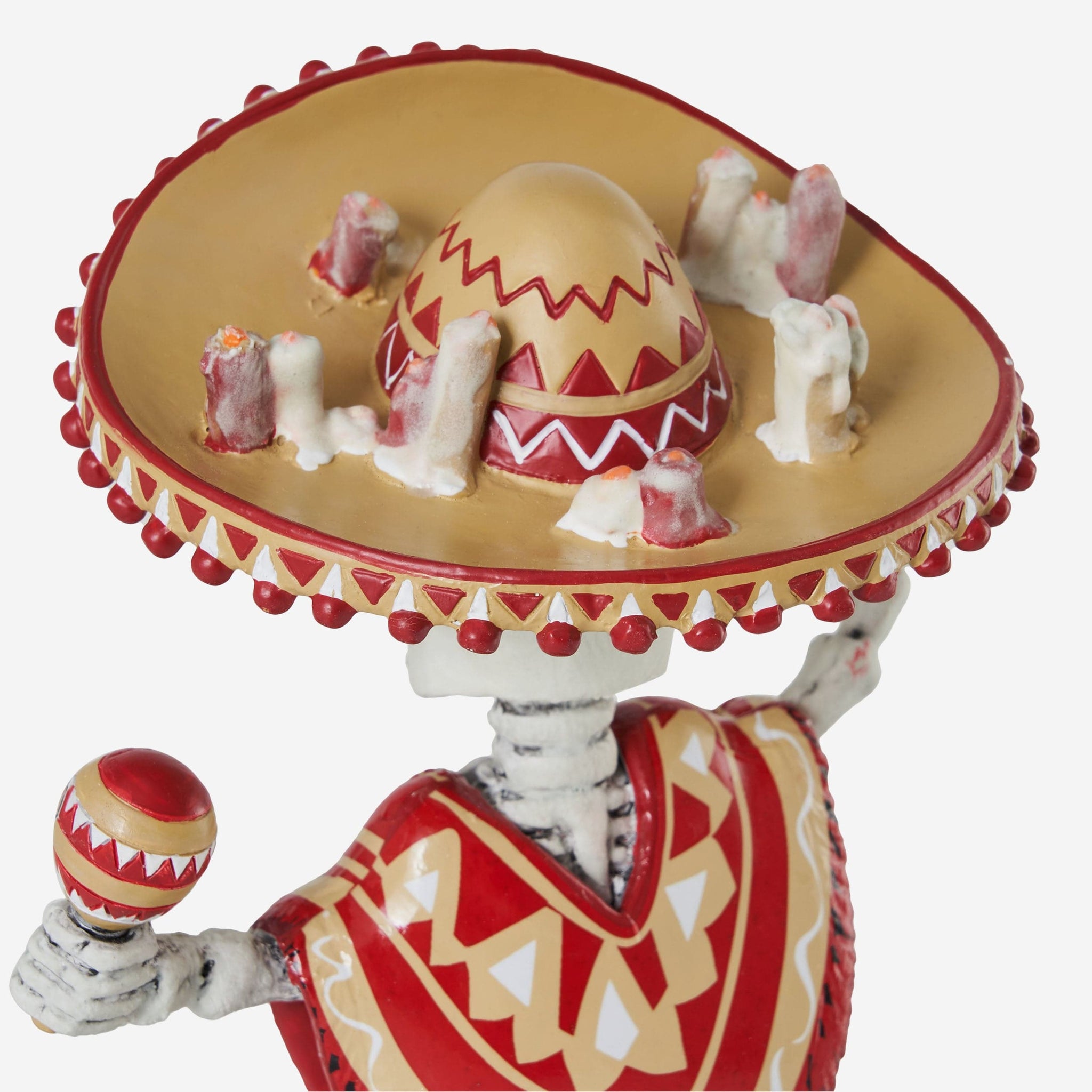 • Portrays skeleton with calavera skull wearing sombrero and poncho and holding maracas, ready to get the party started