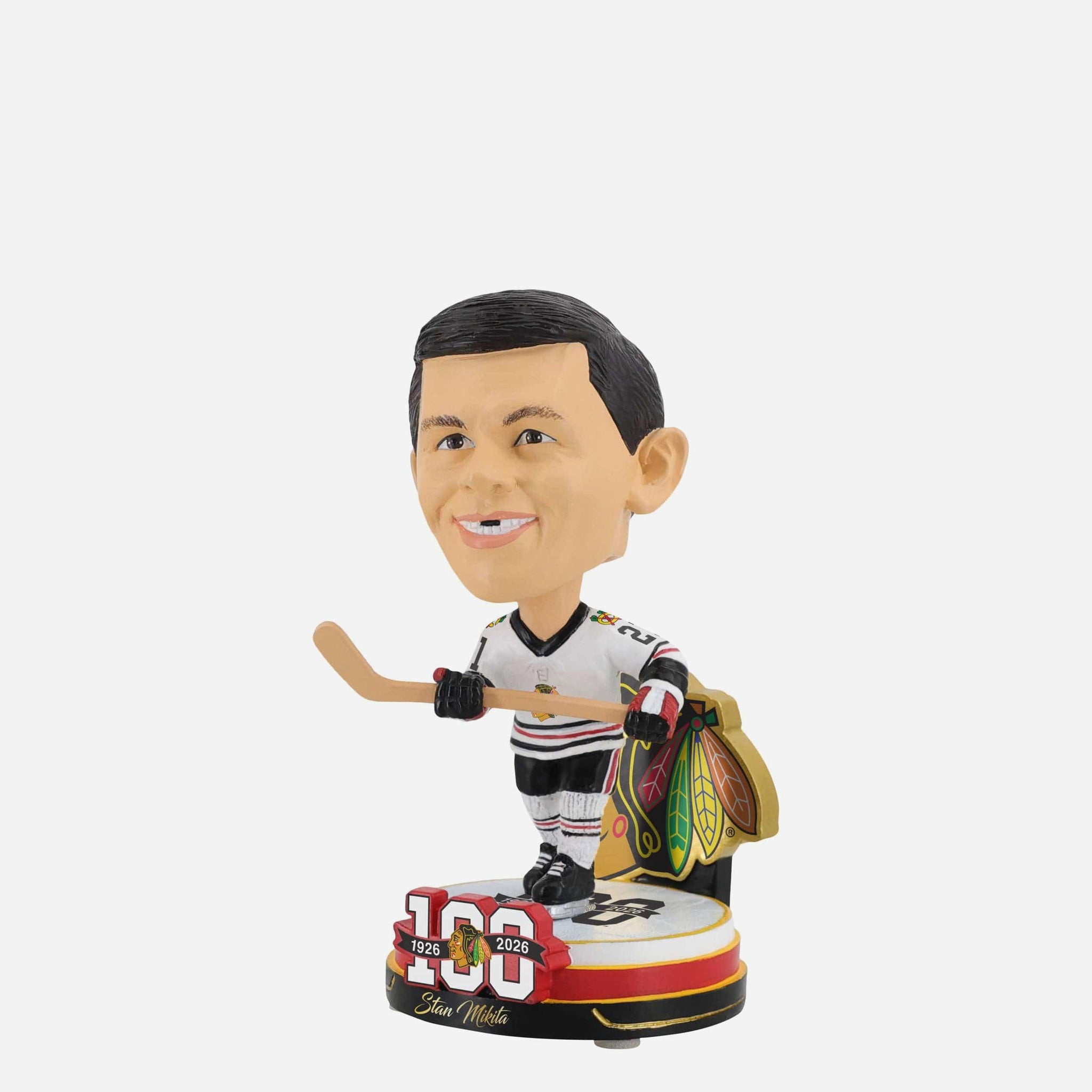 100 years of red, white, and black history. Celebrate a century of hockey in the Windy City with this Stan Mikita Chicago Blackhawks 100th Anniversary Mini Bighead Bobblehead.