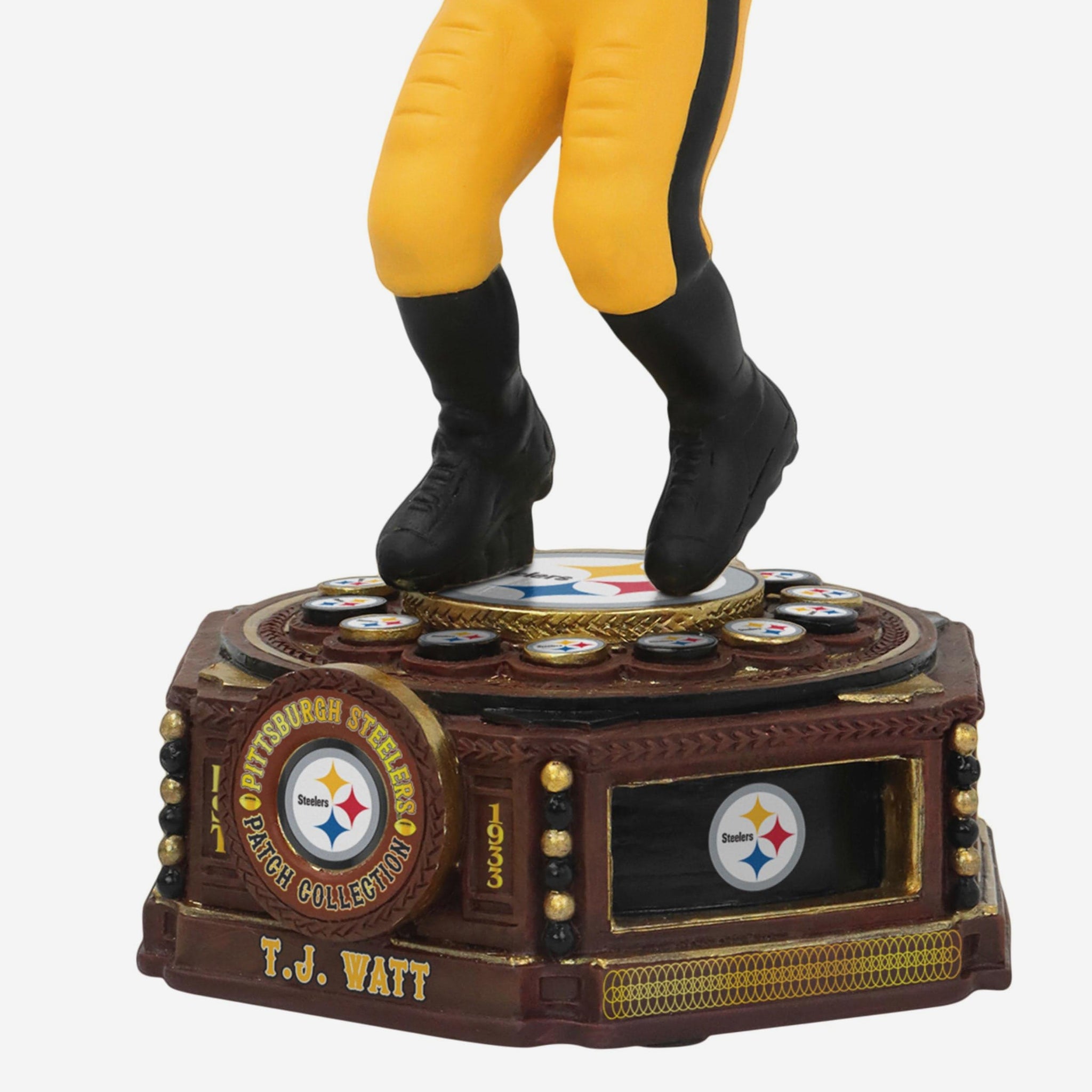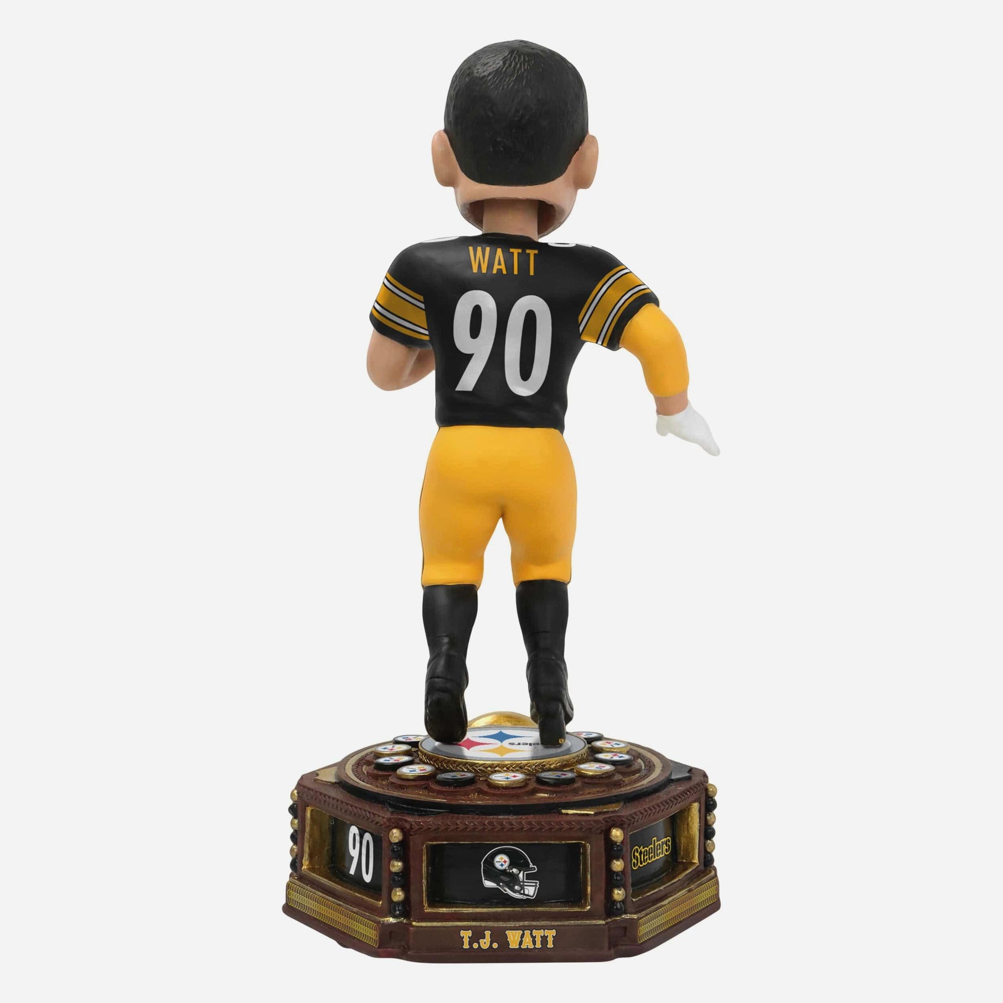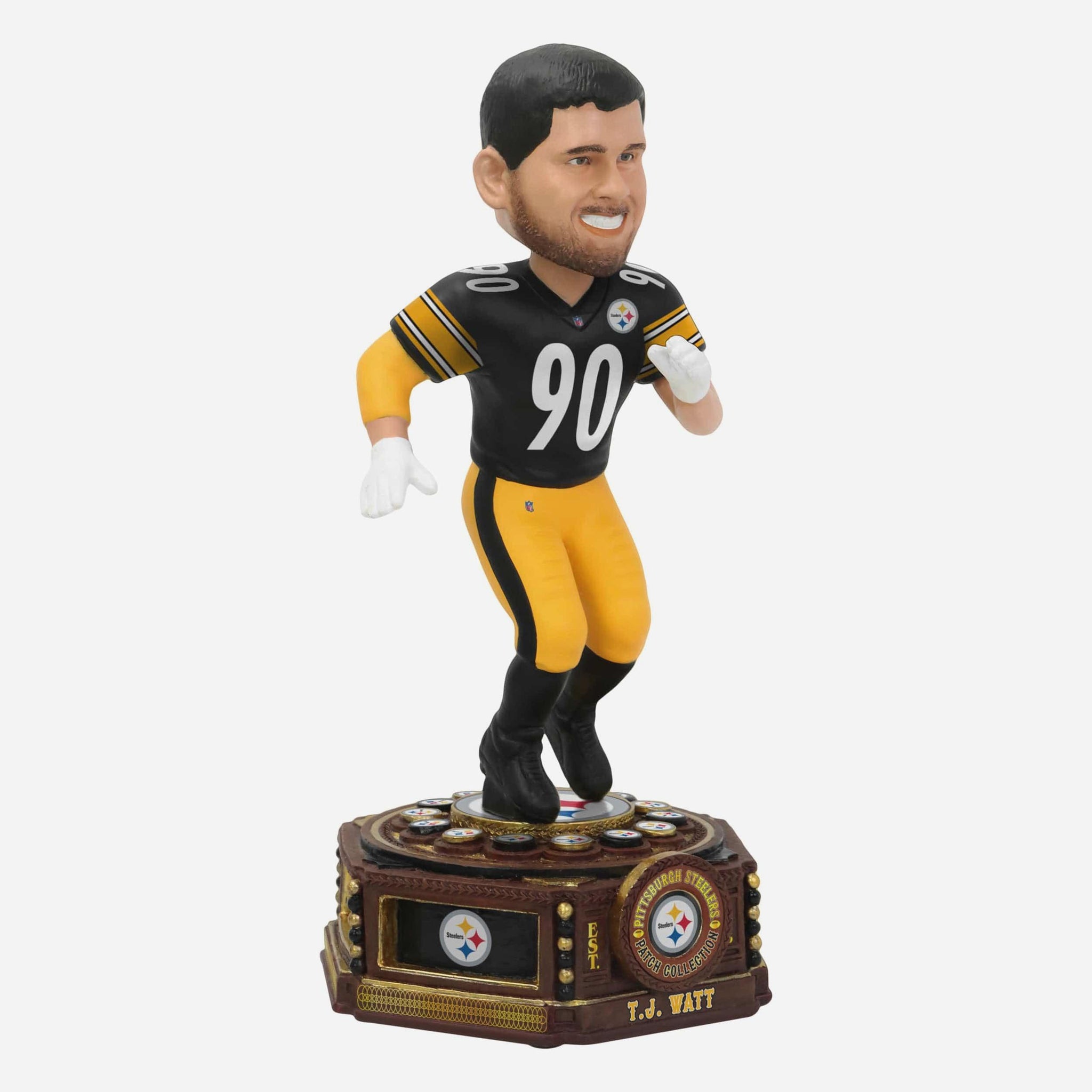 Pass-rush perfection stitched in gold. Add a part of Steelers legacy to your collection with the TJ Watt Pittsburgh Steelers Patch Collection Bobblehead.